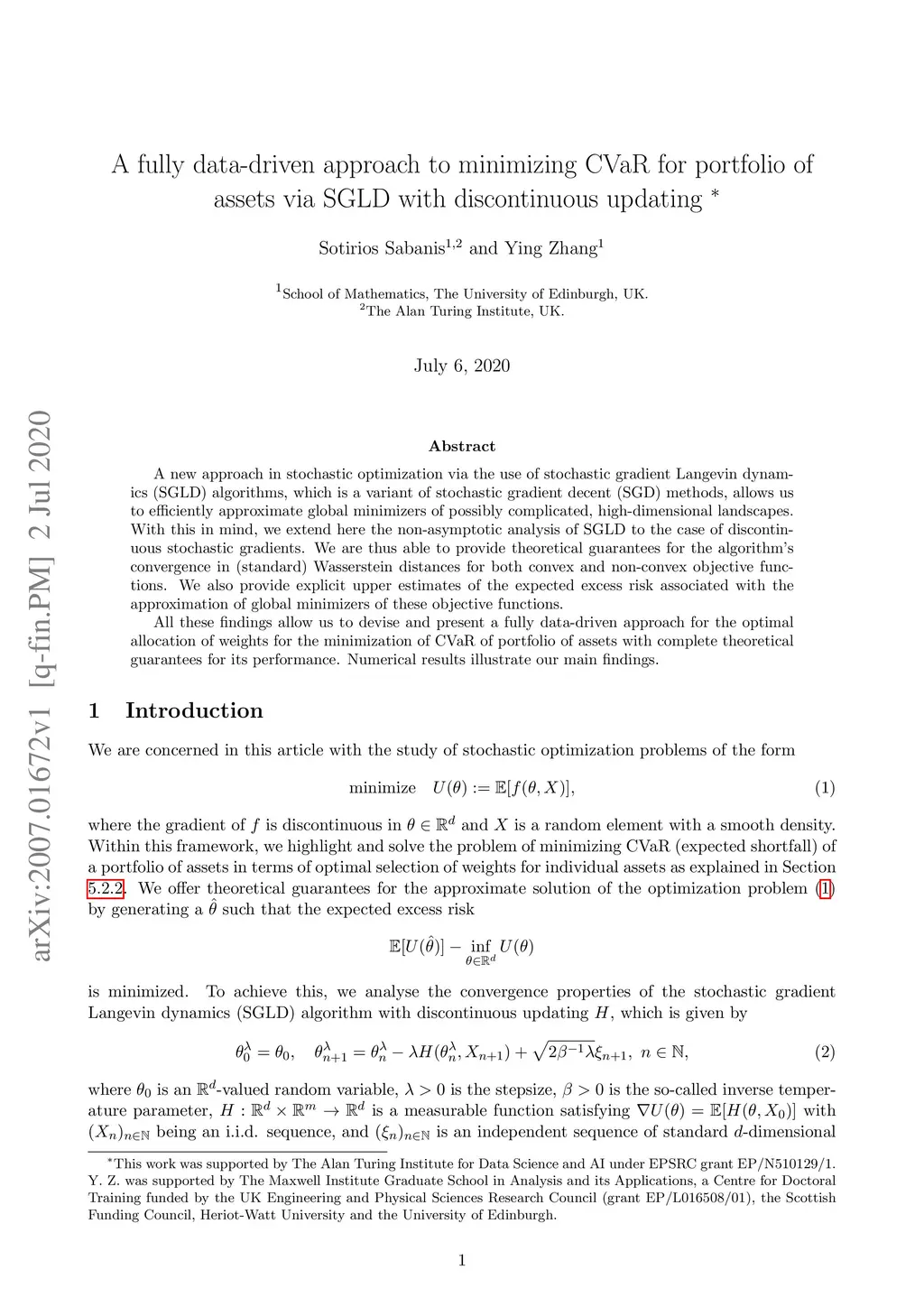 A new approach in stochastic optimization via the use of stochastic gradient Langevin dynamics (SGLD) algorithms, which is a variant of stochastic gradient decent (SGD) methods, allows us to efficiently approximate global minimizers of possibly complicated, high-dimensional landscapes. With this in mind, we extend here the non-asymptotic analysis of SGLD to the case of discontinuous stochastic gradients. We are thus able to provide theoretical guarantees for the algorithm's convergence in (standard) Wasserstein distances for both convex and non-convex objective functions. We also provide explicit upper estimates of the expected excess risk associated with the approximation of global minimizers of these objective functions. All these findings allow us to devise and present a fully data-driven approach for the optimal allocation of weights for the minimization of CVaR of portfolio of assets with complete theoretical guarantees for its performance. Numerical results illustrate our main findings.