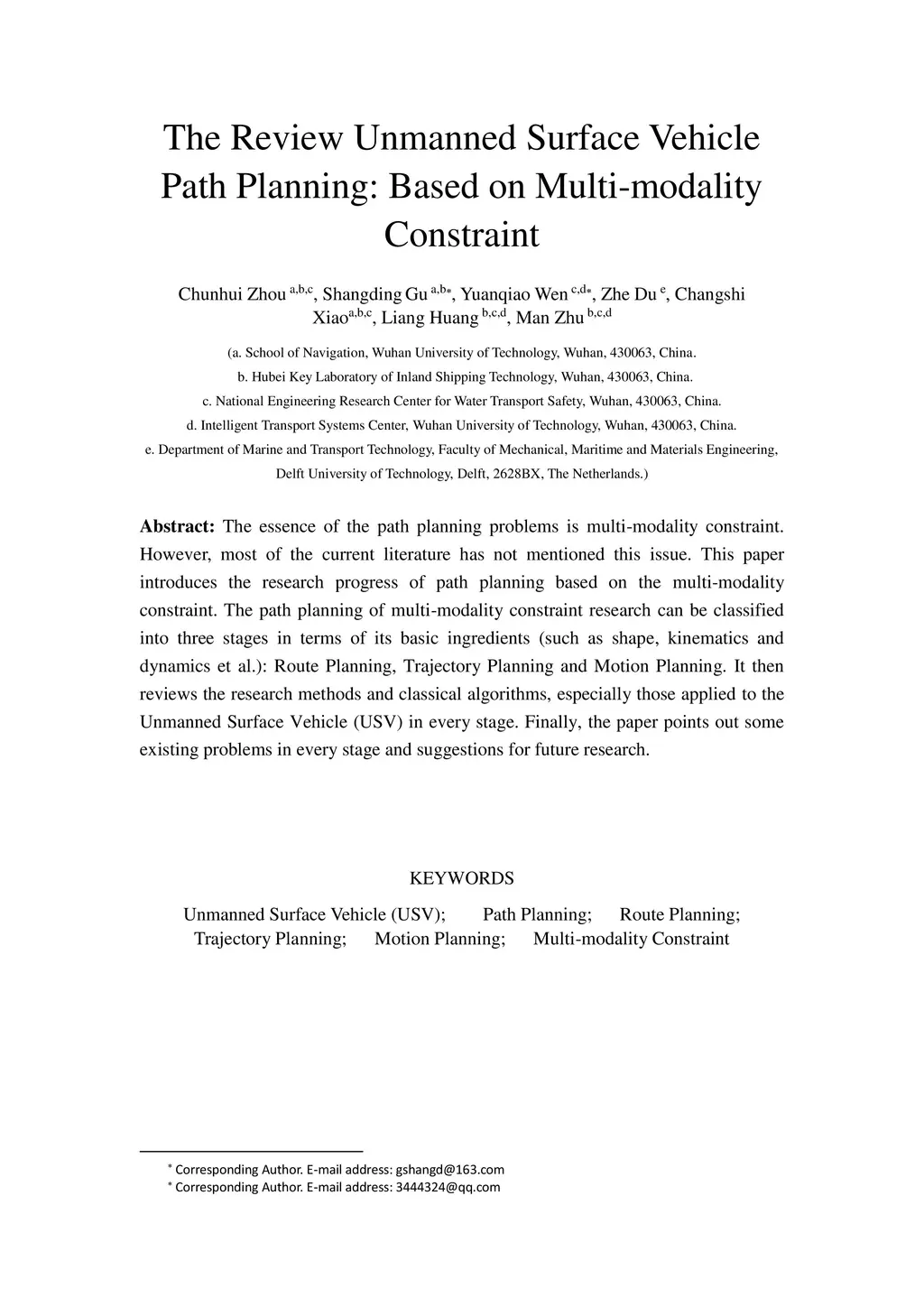 The essence of the path planning problems is multi-modality constraint. However, most of the current literature has not mentioned this issue. This paper introduces the research progress of path planning based on the multi-modality constraint. The path planning of multi-modality constraint research can be classified into three stages in terms of its basic ingredients (such as shape, kinematics and dynamics et al.): Route Planning, Trajectory Planning and Motion Planning. It then reviews the research methods and classical algorithms, especially those applied to the Unmanned Surface Vehicle (USV) in every stage. Finally, the paper points out some existing problems in every stage and suggestions for future research.