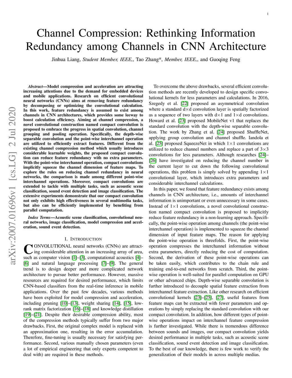 Model compression and acceleration are attracting increasing attentions due to the demand for embedded devices and mobile applications. Research on efficient convolutional neural networks (CNNs) aims at removing feature redundancy by decomposing or optimizing the convolutional calculation. In this work, feature redundancy is assumed to exist among channels in CNN architectures, which provides some leeway to boost calculation efficiency. Aiming at channel compression, a novel convolutional construction named compact convolution is proposed to embrace the progress in spatial convolution, channel grouping and pooling operation. Specifically, the depth-wise separable convolution and the point-wise interchannel operation are utilized to efficiently extract features. Different from the existing channel compression method which usually introduces considerable learnable weights, the proposed compact convolution can reduce feature redundancy with no extra parameters. With the point-wise interchannel operation, compact convolutions implicitly squeeze the channel dimension of feature maps. To explore the rules on reducing channel redundancy in neural networks, the comparison is made among different point-wise interchannel operations. Moreover, compact convolutions are extended to tackle with multiple tasks, such as acoustic scene classification, sound event detection and image classification. The extensive experiments demonstrate that our compact convolution not only exhibits high effectiveness in several multimedia tasks, but also can be efficiently implemented by benefiting from parallel computation.