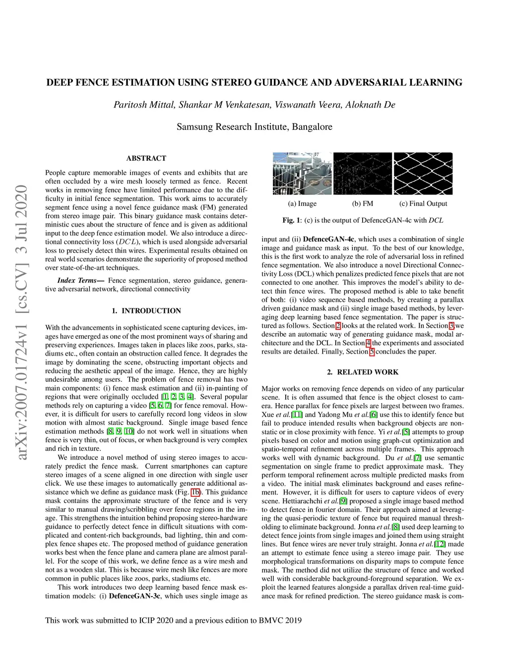 People capture memorable images of events and exhibits that are often occluded by a wire mesh loosely termed as fence. Recent works in removing fence have limited performance due to the difficulty in initial fence segmentation. This work aims to accurately segment fence using a novel fence guidance mask (FM) generated from stereo image pair. This binary guidance mask contains deterministic cues about the structure of fence and is given as additional input to the deep fence estimation model. We also introduce a directional connectivity loss (DCL), which is used alongside adversarial loss to precisely detect thin wires. Experimental results obtained on real world scenarios demonstrate the superiority of proposed method over state-of-the-art techniques.