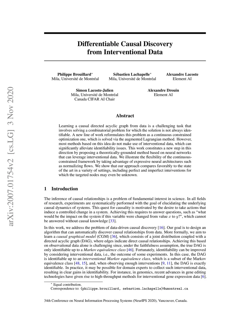 Learning a causal directed acyclic graph from data is a challenging task that involves solving a combinatorial problem for which the solution is not always identifiable. A new line of work reformulates this problem as a continuous constrained optimization one, which is solved via the augmented Lagrangian method. However, most methods based on this idea do not make use of interventional data, which can significantly alleviate identifiability issues. This work constitutes a new step in this direction by proposing a theoretically-grounded method based on neural networks that can leverage interventional data. We illustrate the flexibility of the continuous-constrained framework by taking advantage of expressive neural architectures such as normalizing flows. We show that our approach compares favorably to the state of the art in a variety of settings, including perfect and imperfect interventions for which the targeted nodes may even be unknown.
