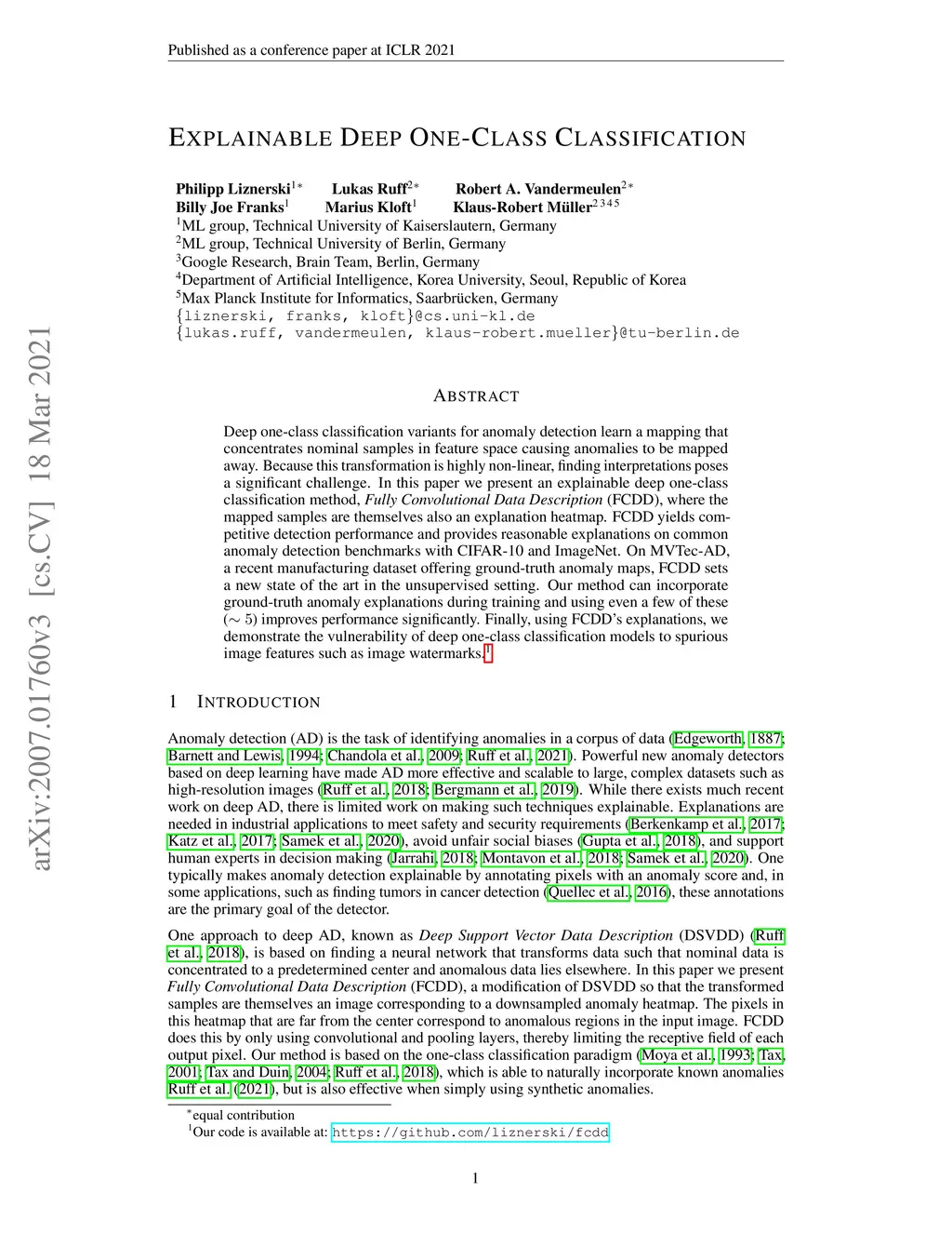 Deep one-class classification variants for anomaly detection learn a mapping that concentrates nominal samples in feature space causing anomalies to be mapped away. Because this transformation is highly non-linear, finding interpretations poses a significant challenge. In this paper we present an explainable deep one-class classification method, Fully Convolutional Data Description (FCDD), where the mapped samples are themselves also an explanation heatmap. FCDD yields competitive detection performance and provides reasonable explanations on common anomaly detection benchmarks with CIFAR-10 and ImageNet. On MVTec-AD, a recent manufacturing dataset offering ground-truth anomaly maps, FCDD sets a new state of the art in the unsupervised setting. Our method can incorporate ground-truth anomaly maps during training and using even a few of these (~5) improves performance significantly. Finally, using FCDD's explanations we demonstrate the vulnerability of deep one-class classification models to spurious image features such as image watermarks.