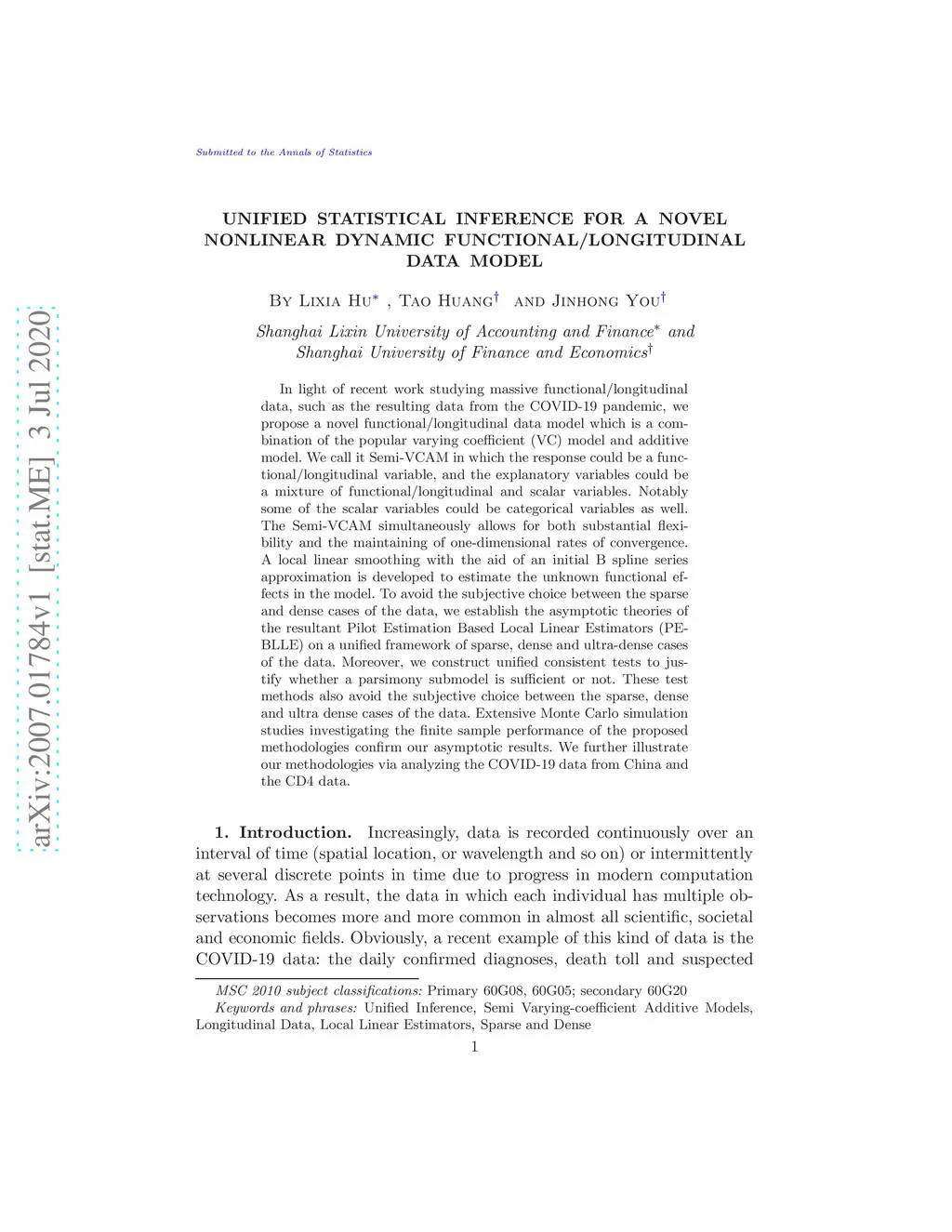 In light of recent work studying massive functional/longitudinal data, such as the resulting data from the COVID-19 pandemic, we propose a novel functional/longitudinal data model which is a combination of the popular varying coefficient (VC) model and additive model. We call it Semi-VCAM in which the response could be a functional/longitudinal variable, and the explanatory variables could be a mixture of functional/longitudinal and scalar variables. Notably some of the scalar variables could be categorical variables as well. The Semi-VCAM simultaneously allows for both substantial flexibility and the maintaining of one-dimensional rates of convergence. A local linear smoothing with the aid of an initial B spline series approximation is developed to estimate the unknown functional effects in the model. To avoid the subjective choice between the sparse and dense cases of the data, we establish the asymptotic theories of the resultant Pilot Estimation Based Local Linear Estimators (PEBLLE) on a unified framework of sparse, dense and ultra-dense cases of the data. Moreover, we construct unified consistent tests to justify whether a parsimony submodel is sufficient or not. These test methods also avoid the subjective choice between the sparse, dense and ultra dense cases of the data. Extensive Monte Carlo simulation studies investigating the finite sample performance of the proposed methodologies confirm our asymptotic results. We further illustrate our methodologies via analyzing the COVID-19 data from China and the CD4 data.