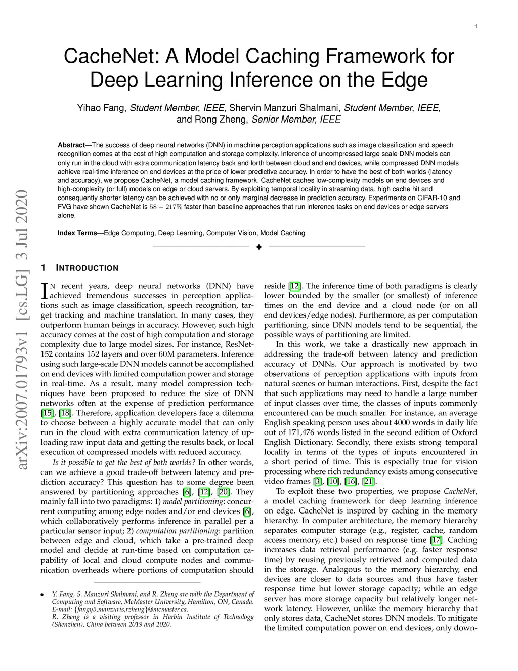 CacheNet: A Model Caching Framework for Deep Learning Inference on the