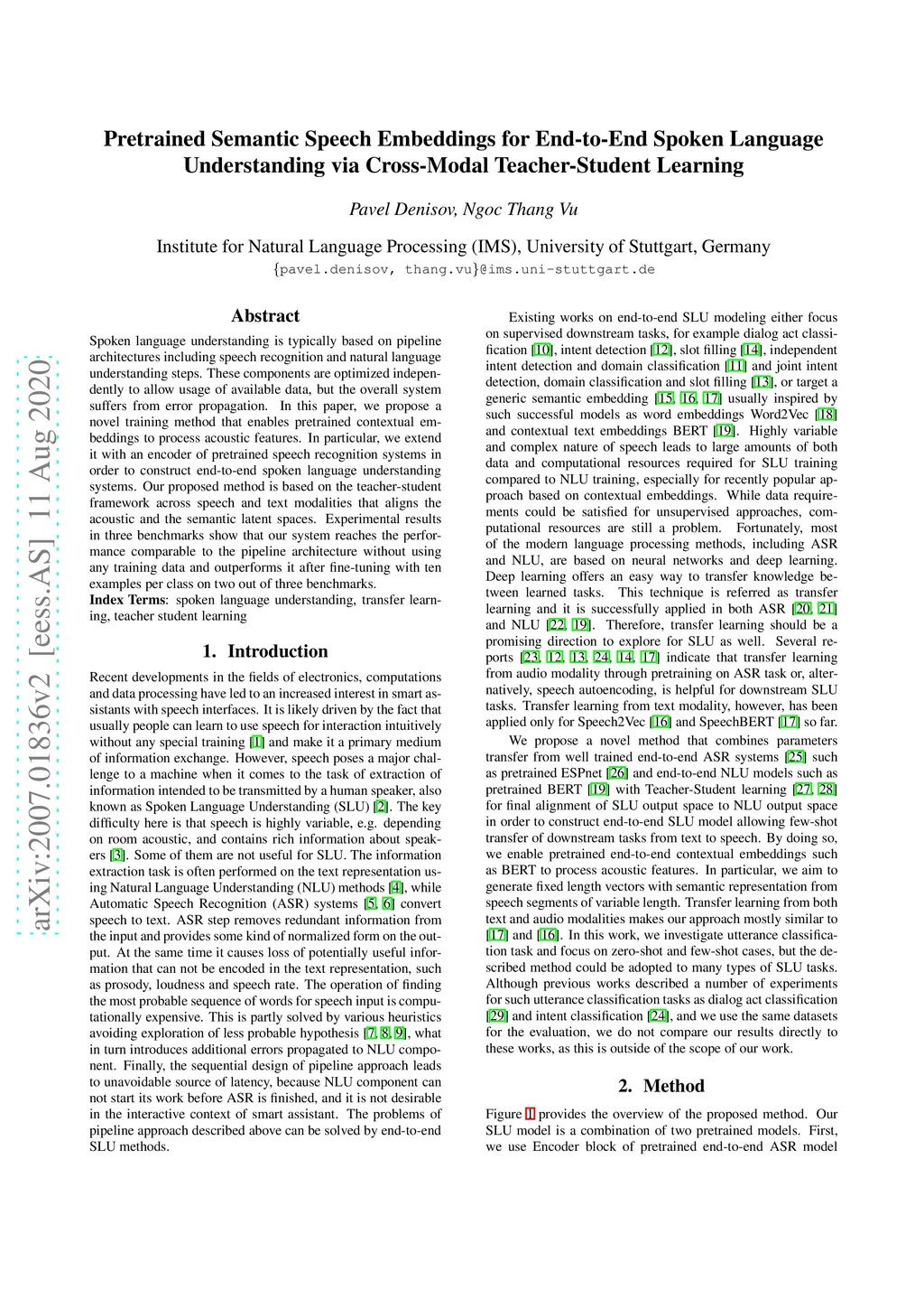 Spoken language understanding is typically based on pipeline architectures including speech recognition and natural language understanding steps. These components are optimized independently to allow usage of available data, but the overall system suffers from error propagation. In this paper, we propose a novel training method that enables pretrained contextual embeddings to process acoustic features. In particular, we extend it with an encoder of pretrained speech recognition systems in order to construct end-to-end spoken language understanding systems. Our proposed method is based on the teacher-student framework across speech and text modalities that aligns the acoustic and the semantic latent spaces. Experimental results in three benchmarks show that our system reaches the performance comparable to the pipeline architecture without using any training data and outperforms it after fine-tuning with ten examples per class on two out of three benchmarks.