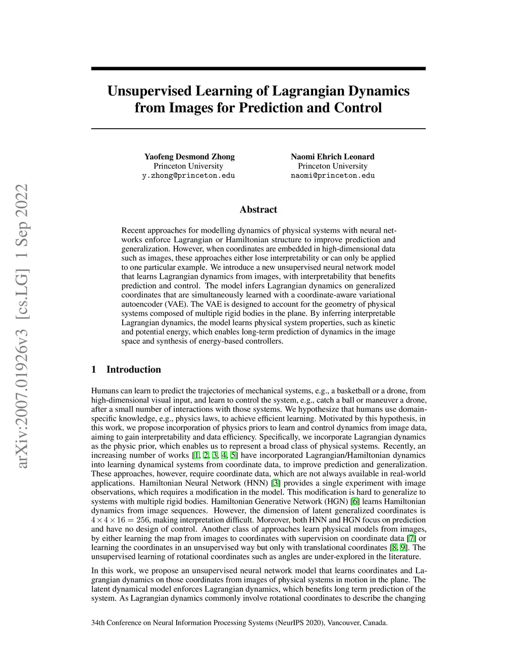 Unsupervised Learning of Lagrangian Dynamics from Images for Prediction and Control