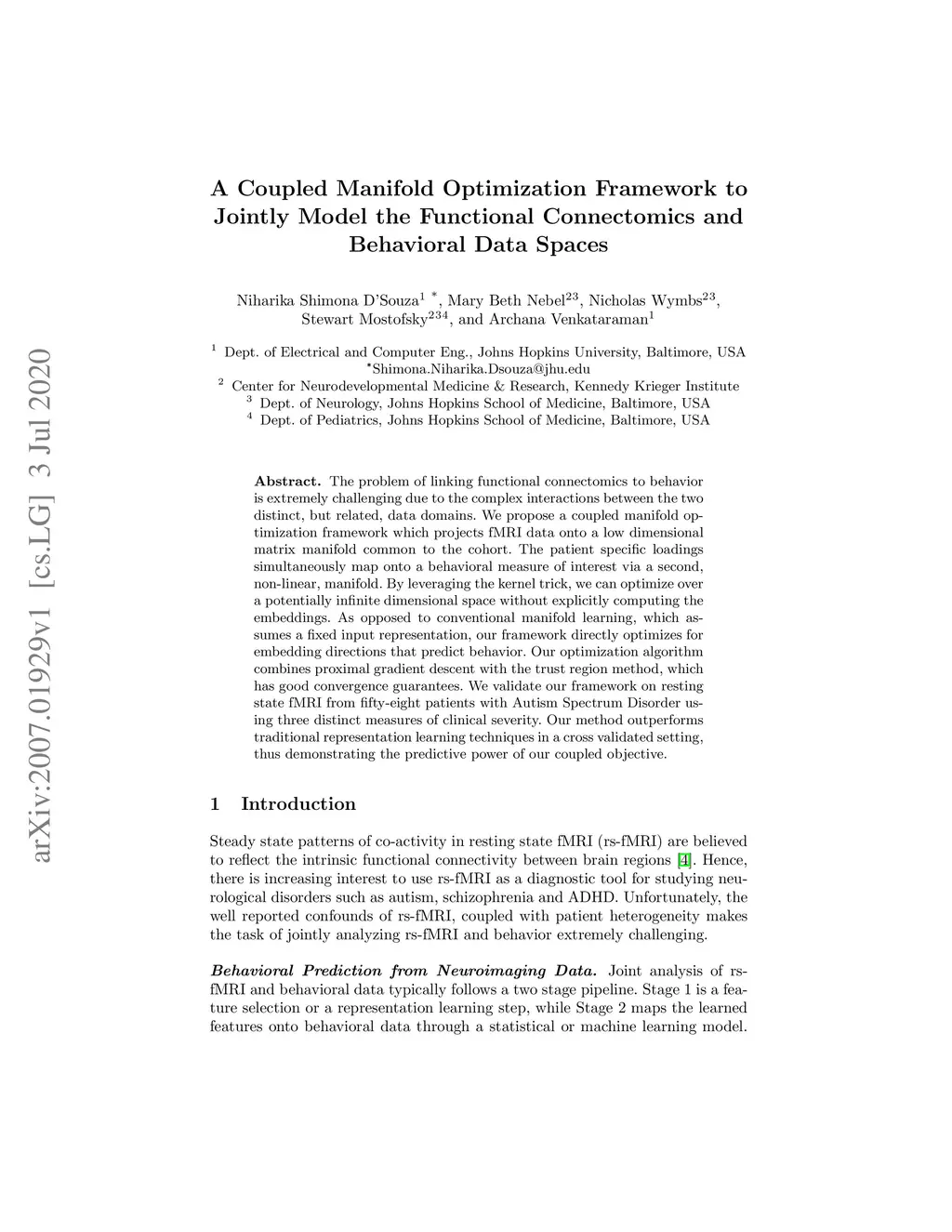 The problem of linking functional connectomics to behavior is extremely challenging due to the complex interactions between the two distinct, but related, data domains. We propose a coupled manifold optimization framework which projects fMRI data onto a low dimensional matrix manifold common to the cohort. The patient specific loadings simultaneously map onto a behavioral measure of interest via a second, non-linear, manifold. By leveraging the kernel trick, we can optimize over a potentially infinite dimensional space without explicitly computing the embeddings. As opposed to conventional manifold learning, which assumes a fixed input representation, our framework directly optimizes for embedding directions that predict behavior. Our optimization algorithm combines proximal gradient descent with the trust region method, which has good convergence guarantees. We validate our framework on resting state fMRI from fifty-eight patients with Autism Spectrum Disorder using three distinct measures of clinical severity. Our method outperforms traditional representation learning techniques in a cross validated setting, thus demonstrating the predictive power of our coupled objective.