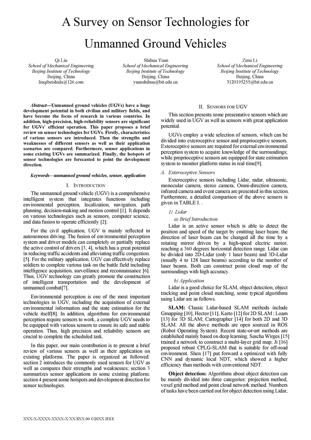 Unmanned ground vehicles have a huge development potential in both civilian and military fields, and have become the focus of research in various countries. In addition, high-precision, high-reliability sensors are significant for UGVs' efficient operation. This paper proposes a brief review on sensor technologies for UGVs. Firstly, characteristics of various sensors are introduced. Then the strengths and weaknesses of different sensors as well as their application scenarios are compared. Furthermore, sensor applications in some existing UGVs are summarized. Finally, the hotspots of sensor technologies are forecasted to point the development direction.