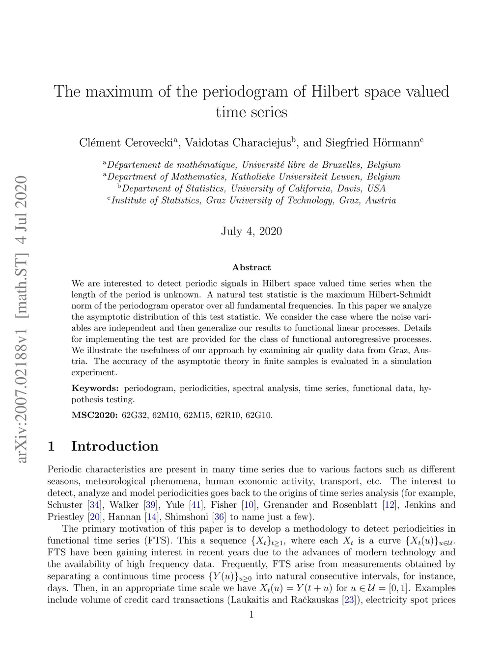 We are interested to detect periodic signals in Hilbert space valued time series when the length of the period is unknown. A natural test statistic is the maximum Hilbert-Schmidt norm of the periodogram operator over all fundamental frequencies. In this paper we analyze the asymptotic distribution of this test statistic. We consider the case where the noise variables are independent and then generalize our results to functional linear processes. Details for implementing the test are provided for the class of functional autoregressive processes. We illustrate the usefulness of our approach by examining air quality data from Graz, Austria. The accuracy of the asymptotic theory in finite samples is evaluated in a simulation experiment.