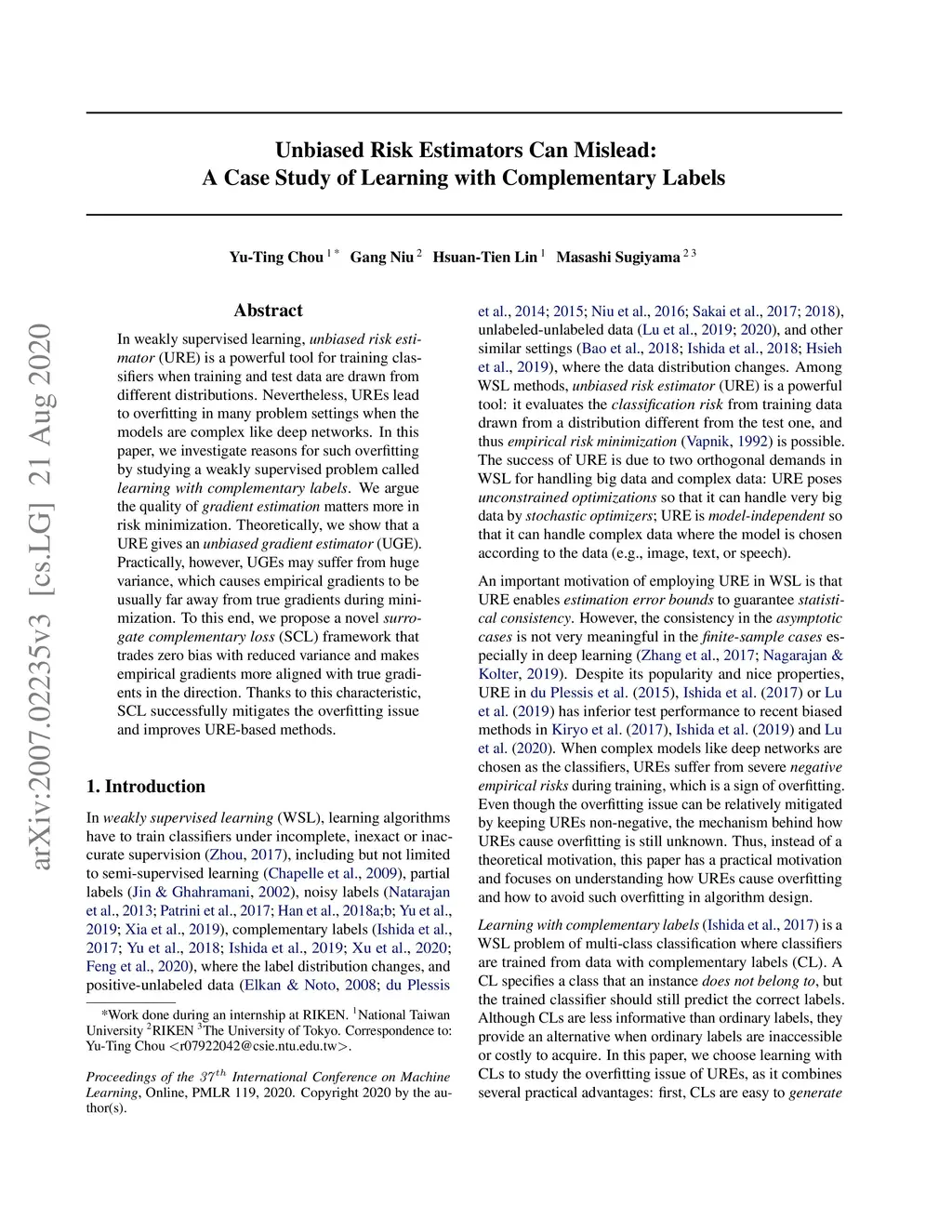 In weakly supervised learning, unbiased risk estimator(URE) is a powerful tool for training classifiers when training and test data are drawn from different distributions. Nevertheless, UREs lead to overfitting in many problem settings when the models are complex like deep networks. In this paper, we investigate reasons for such overfitting by studying a weakly supervised problem called learning with complementary labels. We argue the quality of gradient estimation matters more in risk minimization. Theoretically, we show that a URE gives an unbiased gradient estimator(UGE). Practically, however, UGEs may suffer from huge variance, which causes empirical gradients to be usually far away from true gradients during minimization. To this end, we propose a novel surrogate complementary loss(SCL) framework that trades zero bias with reduced variance and makes empirical gradients more aligned with true gradients in the direction. Thanks to this characteristic, SCL successfully mitigates the overfitting issue and improves URE-based methods.