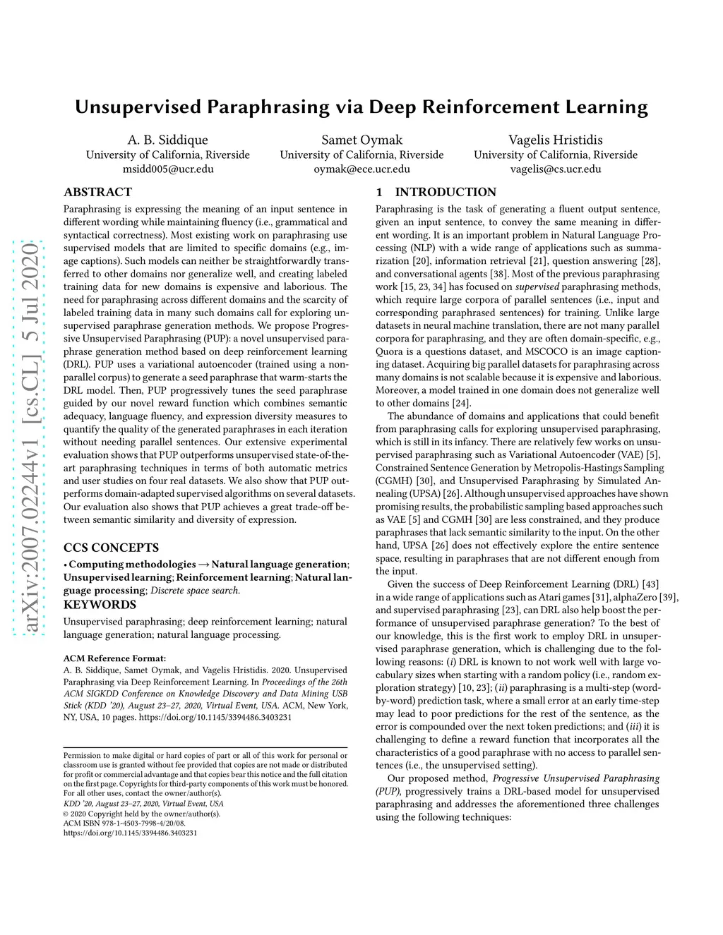 Unsupervised Paraphrasing via Deep Reinforcement Learning