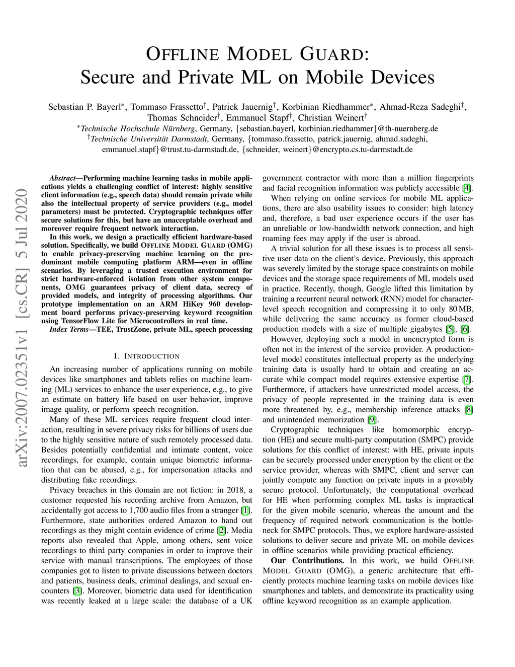 Performing machine learning tasks in mobile applications yields a challenging conflict of interest: highly sensitive client information (e.g., speech data) should remain private while also the intellectual property of service providers (e.g., model parameters) must be protected. Cryptographic techniques offer secure solutions for this, but have an unacceptable overhead and moreover require frequent network interaction. In this work, we design a practically efficient hardware-based solution. Specifically, we build Offline Model Guard (OMG) to enable privacy-preserving machine learning on the predominant mobile computing platform ARM - even in offline scenarios. By leveraging a trusted execution environment for strict hardware-enforced isolation from other system components, OMG guarantees privacy of client data, secrecy of provided models, and integrity of processing algorithms. Our prototype implementation on an ARM HiKey 960 development board performs privacy-preserving keyword recognition using TensorFlow Lite for Microcontrollers in real time.