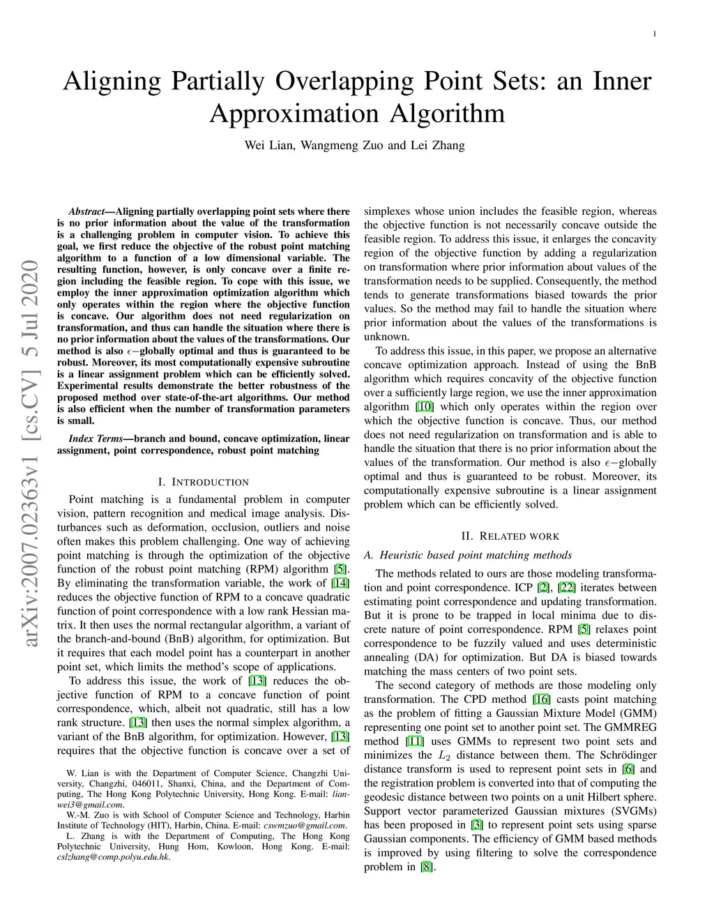 Aligning partially overlapping point sets where there is no prior information about the value of the transformation is a challenging problem in computer vision. To achieve this goal, we first reduce the objective of the robust point matching algorithm to a function of a low dimensional variable. The resulting function, however, is only concave over a finite region including the feasible region. To cope with this issue, we employ the inner approximation optimization algorithm which only operates within the region where the objective function is concave. Our algorithm does not need regularization on transformation, and thus can handle the situation where there is no prior information about the values of the transformations. Our method is also globally optimal and thus is guaranteed to be robust. Moreover, its most computationally expensive subroutine is a linear assignment problem which can be efficiently solved. Experimental results demonstrate the better robustness of the proposed method over state-of-the-art algorithms. Our method is also efficient when the number of transformation parameters is small.