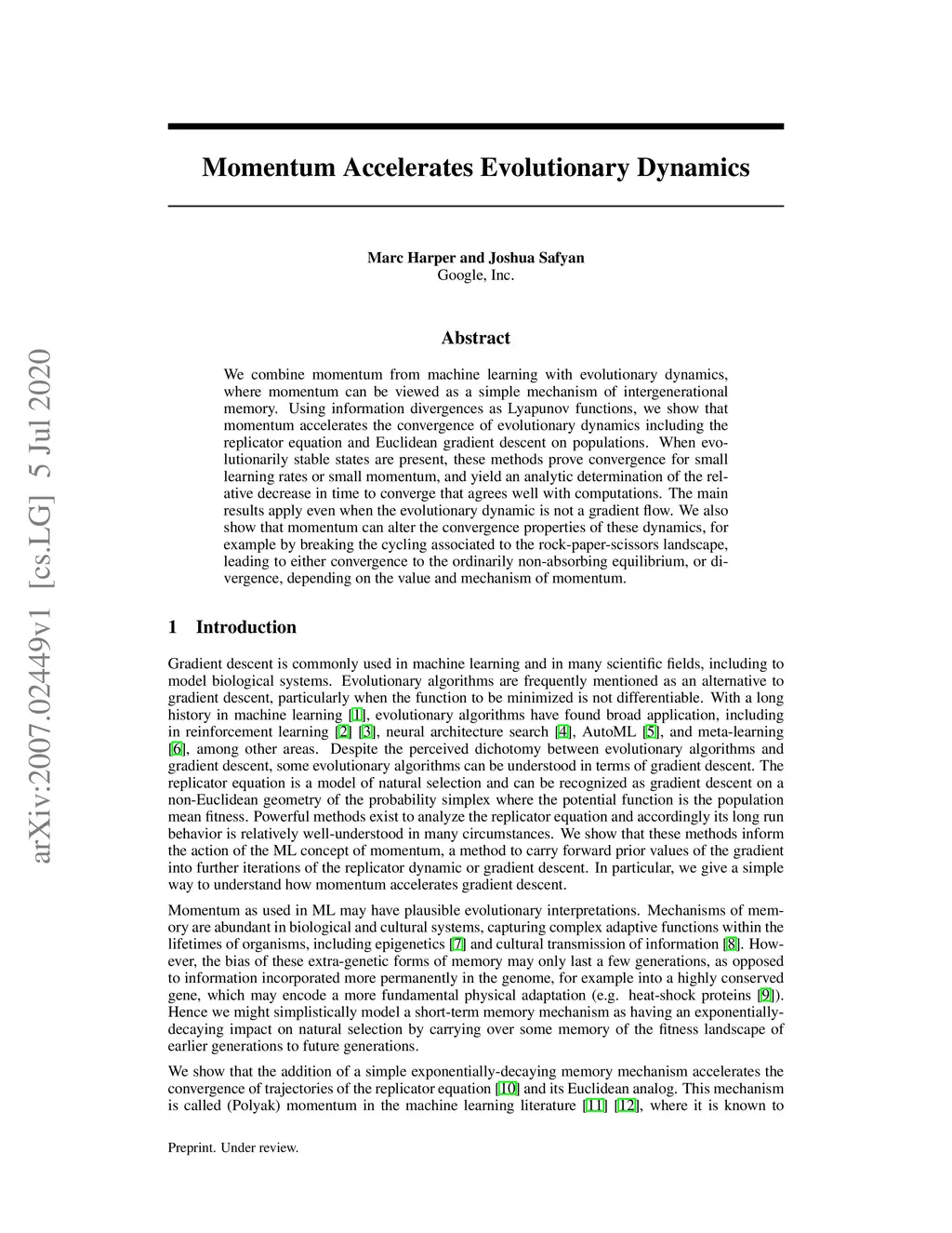 We combine momentum from machine learning with evolutionary dynamics, where momentum can be viewed as a simple mechanism of intergenerational memory. Using information divergences as Lyapunov functions, we show that momentum accelerates the convergence of evolutionary dynamics including the replicator equation and Euclidean gradient descent on populations. When evolutionarily stable states are present, these methods prove convergence for small learning rates or small momentum, and yield an analytic determination of the relative decrease in time to converge that agrees well with computations. The main results apply even when the evolutionary dynamic is not a gradient flow. We also show that momentum can alter the convergence properties of these dynamics, for example by breaking the cycling associated to the rock-paper-scissors landscape, leading to either convergence to the ordinarily non-absorbing equilibrium, or divergence, depending on the value and mechanism of momentum.