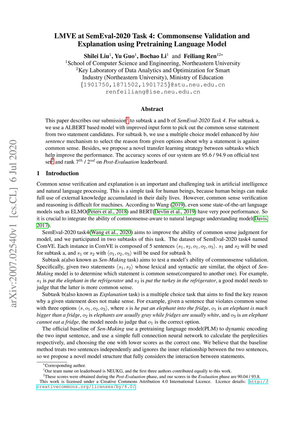 LMVE at SemEval-2020 Task 4: Commonsense Validation and Explanation