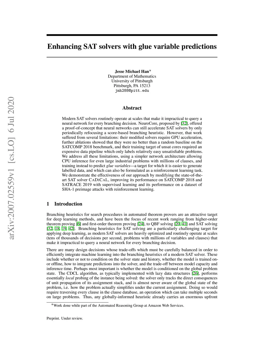 Modern SAT solvers routinely operate at scales that make it impractical to query a neural network for every branching decision. NeuroCore, proposed by Selsam and Bjorner, offered a proof-of-concept that neural networks can still accelerate SAT solvers by only periodically refocusing a score-based branching heuristic. However, that work suffered from several limitations: their modified solvers require GPU acceleration, further ablations showed that they were no better than a random baseline on the SATCOMP 2018 benchmark, and their training target of unsat cores required an expensive data pipeline which only labels relatively easy unsatisfiable problems. We address all these limitations, using a simpler network architecture allowing CPU inference for even large industrial problems with millions of clauses, and training instead to predict {\em glue variables}---a target for which it is easier to generate labelled data, and which can also be formulated as a reinforcement learning task. We demonstrate the effectiveness of our approach by modifying the state-of-the-art SAT solver CaDiCaL, improving its performance on SATCOMP 2018 and SATRACE 2019 with supervised learning and its performance on a dataset of SHA-1 preimage attacks with reinforcement learning.