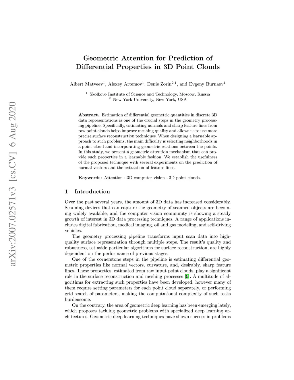Estimation of differential geometric quantities in discrete 3D data representations is one of the crucial steps in the geometry processing pipeline. Specifically, estimating normals and sharp feature lines from raw point cloud helps improve meshing quality and allows us to use more precise surface reconstruction techniques. When designing a learnable approach to such problems, the main difficulty is selecting neighborhoods in a point cloud and incorporating geometric relations between the points. In this study, we present a geometric attention mechanism that can provide such properties in a learnable fashion. We establish the usefulness of the proposed technique with several experiments on the prediction of normal vectors and the extraction of feature lines.