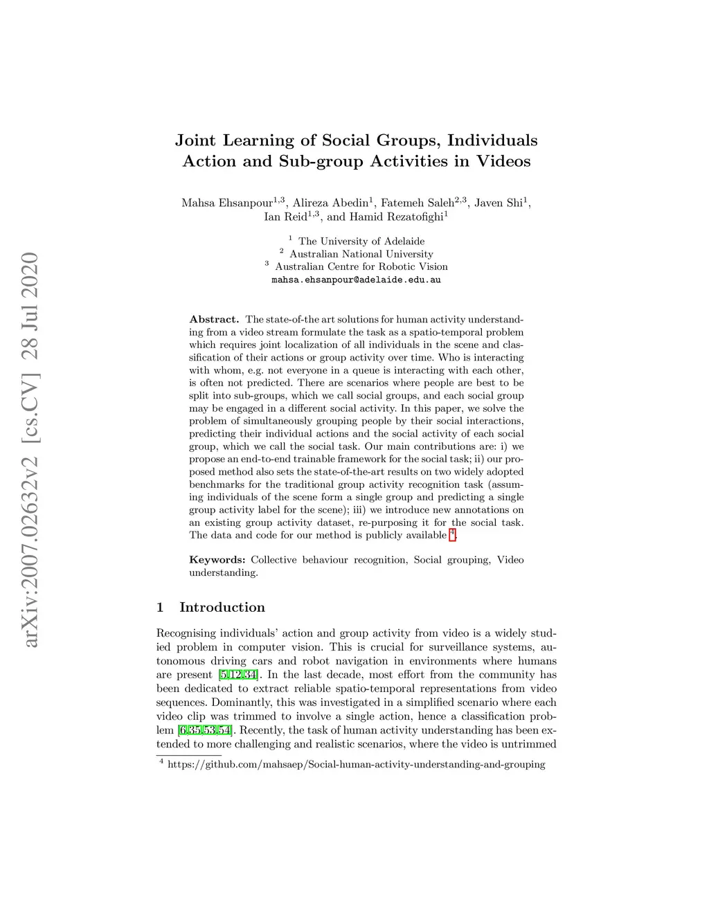 The state-of-the art solutions for human activity understanding from a video stream formulate the task as a spatio-temporal problem which requires joint localization of all individuals in the scene and classification of their actions or group activity over time. Who is interacting with whom, e.g. not everyone in a queue is interacting with each other, is often not predicted. There are scenarios where people are best to be split into sub-groups, which we call social groups, and each social group may be engaged in a different social activity. In this paper, we solve the problem of simultaneously grouping people by their social interactions, predicting their individual actions and the social activity of each social group, which we call the social task. Our main contributions are: i) we propose an end-to-end trainable framework for the social task; ii) our proposed method also sets the state-of-the-art results on two widely adopted benchmarks for the traditional group activity recognition task (assuming individuals of the scene form a single group and predicting a single group activity label for the scene); iii) we introduce new annotations on an existing group activity dataset, re-purposing it for the social task.