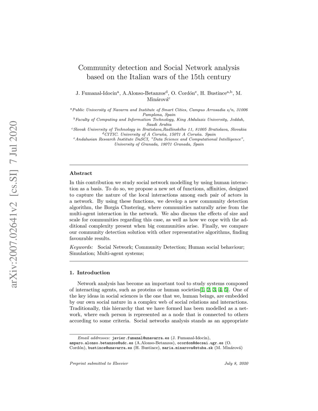 In this contribution we study social network modelling by using human interaction as a basis. To do so, we propose a new set of functions, affinities, designed to capture the nature of the local interactions among each pair of actors in a network. By using these functions, we develop a new community detection algorithm, the Borgia Clustering, where communities naturally arise from the multi-agent interaction in the network. We also discuss the effects of size and scale for communities regarding this case, as well as how we cope with the additional complexity present when big communities arise. Finally, we compare our community detection solution with other representative algorithms, finding favourable results.