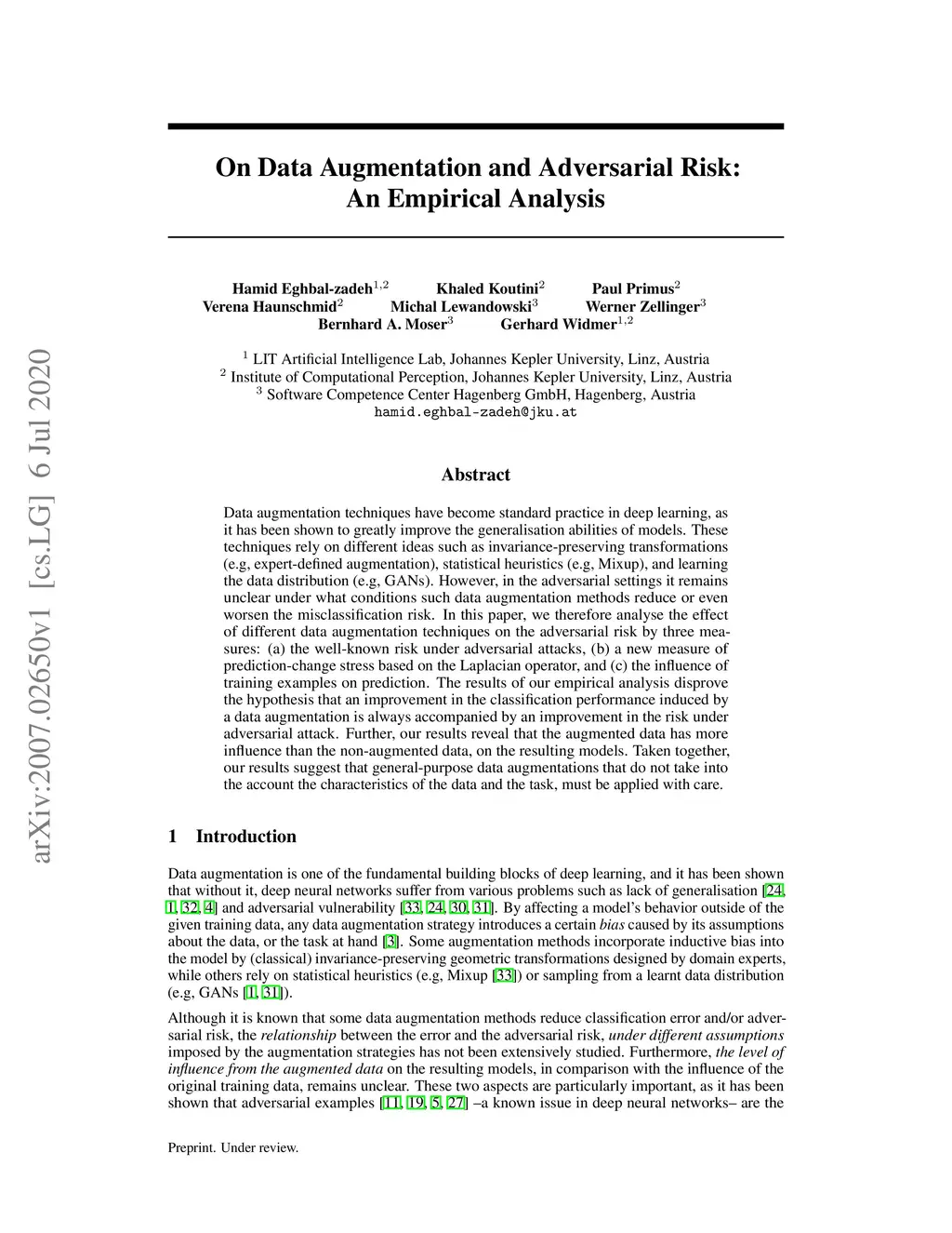 Data augmentation techniques have become standard practice in deep learning, as it has been shown to greatly improve the generalisation abilities of models. These techniques rely on different ideas such as invariance-preserving transformations (e.g, expert-defined augmentation), statistical heuristics (e.g, Mixup), and learning the data distribution (e.g, GANs). However, in the adversarial settings it remains unclear under what conditions such data augmentation methods reduce or even worsen the misclassification risk. In this paper, we therefore analyse the effect of different data augmentation techniques on the adversarial risk by three measures: (a) the well-known risk under adversarial attacks, (b) a new measure of prediction-change stress based on the Laplacian operator, and (c) the influence of training examples on prediction. The results of our empirical analysis disprove the hypothesis that an improvement in the classification performance induced by a data augmentation is always accompanied by an improvement in the risk under adversarial attack. Further, our results reveal that the augmented data has more influence than the non-augmented data, on the resulting models. Taken together, our results suggest that general-purpose data augmentations that do not take into the account the characteristics of the data and the task, must be applied with care.