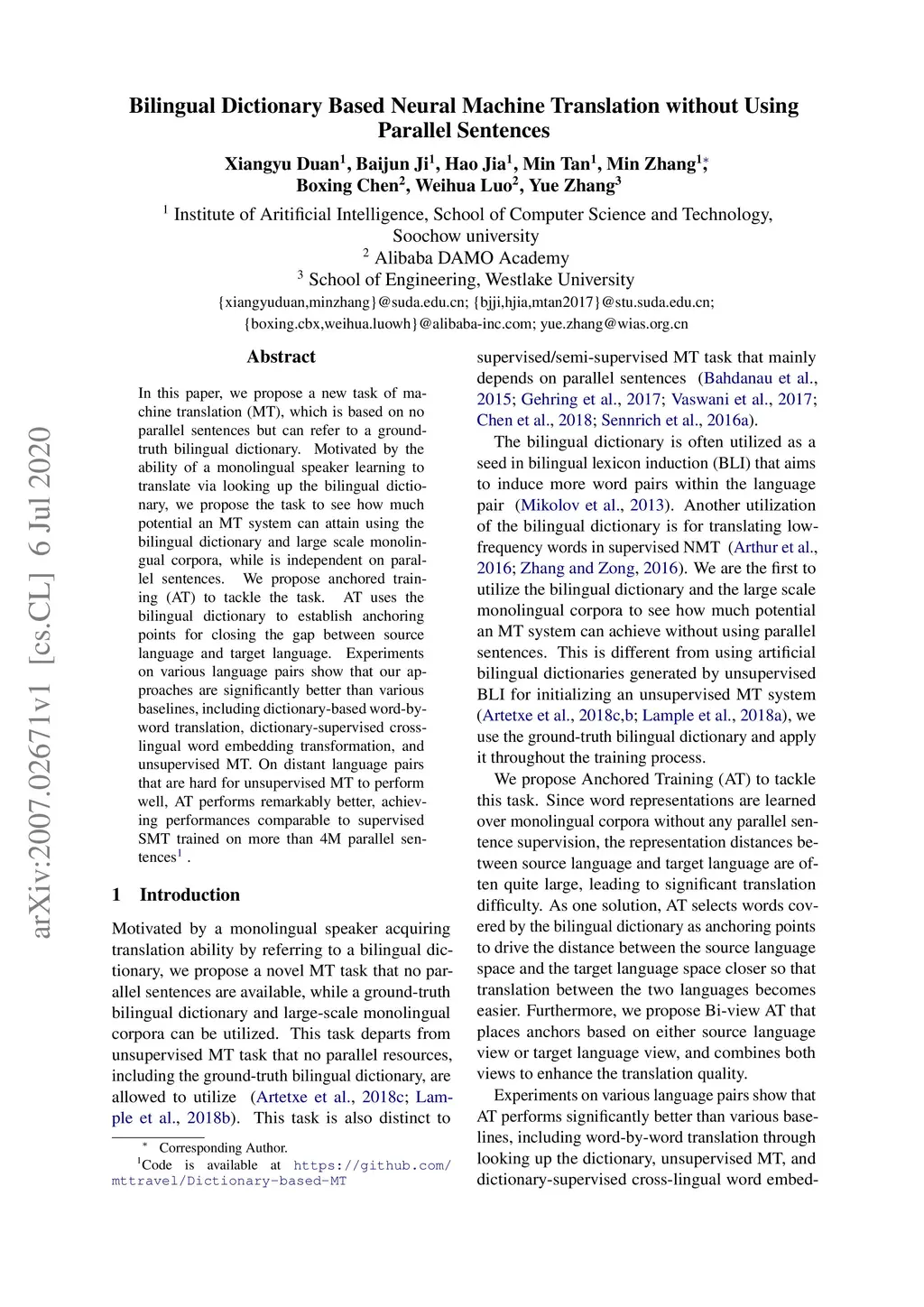 In this paper, we propose a new task of machine translation (MT), which is based on no parallel sentences but can refer to a ground-truth bilingual dictionary. Motivated by the ability of a monolingual speaker learning to translate via looking up the bilingual dictionary, we propose the task to see how much potential an MT system can attain using the bilingual dictionary and large scale monolingual corpora, while is independent on parallel sentences. We propose anchored training (AT) to tackle the task. AT uses the bilingual dictionary to establish anchoring points for closing the gap between source language and target language. Experiments on various language pairs show that our approaches are significantly better than various baselines, including dictionary-based word-by-word translation, dictionary-supervised cross-lingual word embedding transformation, and unsupervised MT. On distant language pairs that are hard for unsupervised MT to perform well, AT performs remarkably better, achieving performances comparable to supervised SMT trained on more than 4M parallel sentences.