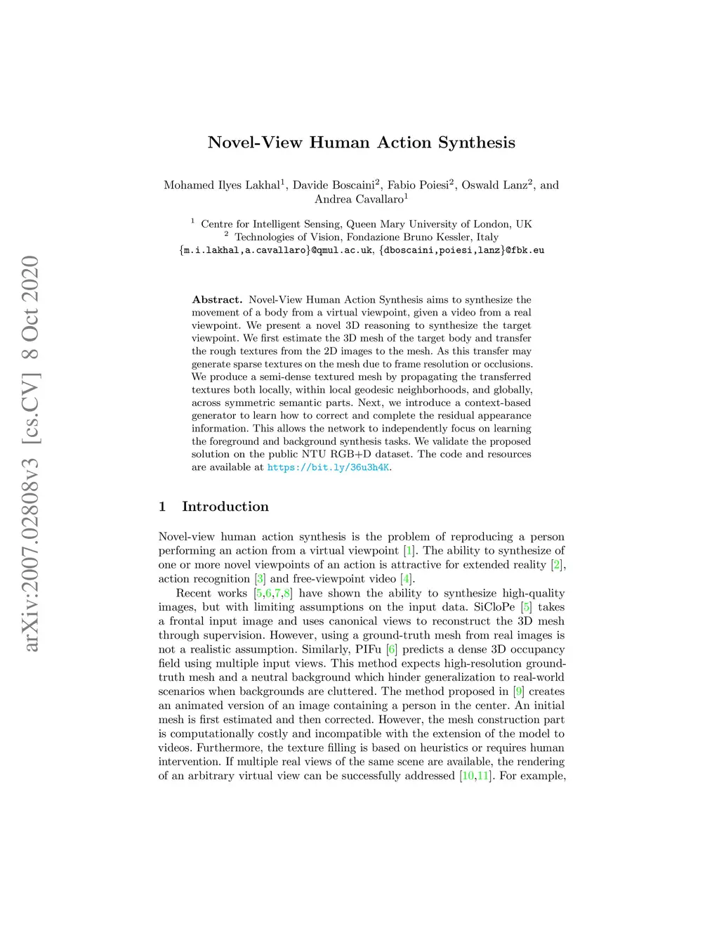 Novel-View Human Action Synthesis aims to synthesize the movement of a body from a virtual viewpoint, given a video from a real viewpoint. We present a novel 3D reasoning to synthesize the target viewpoint. We first estimate the 3D mesh of the target body and transfer the rough textures from the 2D images to the mesh. As this transfer may generate sparse textures on the mesh due to frame resolution or occlusions. We produce a semi-dense textured mesh by propagating the transferred textures both locally, within local geodesic neighborhoods, and globally, across symmetric semantic parts. Next, we introduce a context-based generator to learn how to correct and complete the residual appearance information. This allows the network to independently focus on learning the foreground and background synthesis tasks. We validate the proposed solution on the public NTU RGB+D dataset. The code and resources are available at https://bit.ly/36u3h4K.
