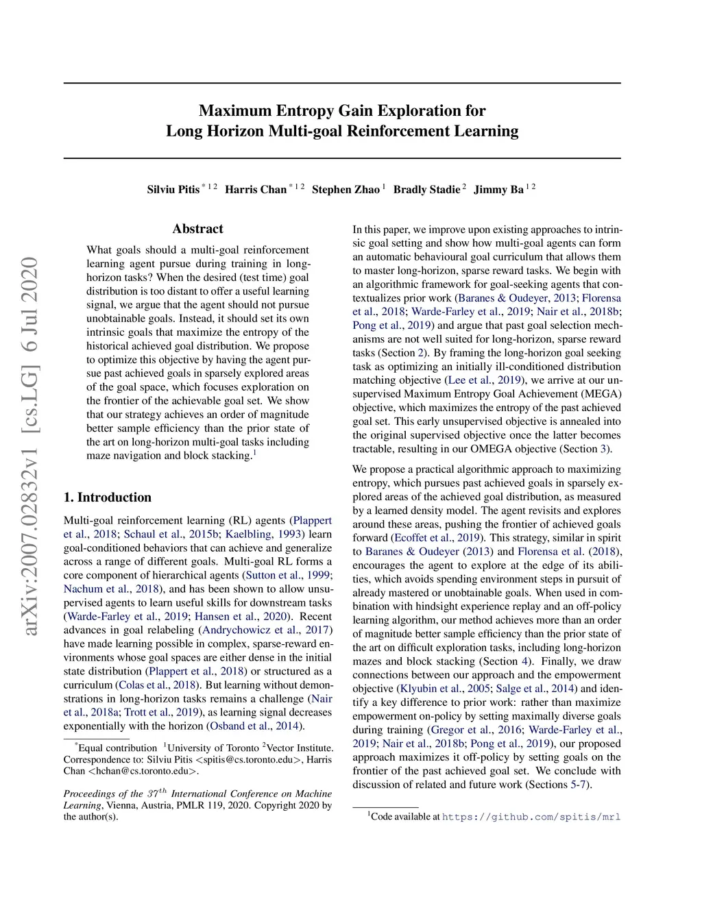 Maximum Entropy Gain Exploration for Long Horizon Multi-goal