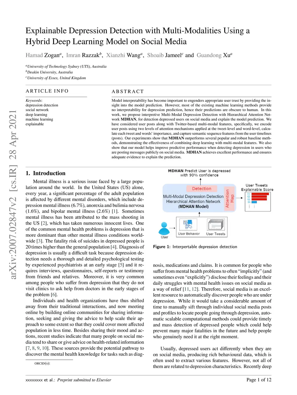 Model interpretability has become important to engenders appropriate user trust by providing the insight into the model prediction. However, most of the existing machine learning methods provide no interpretability for depression prediction, hence their predictions are obscure to human. In this work, we propose interpretive Multi-Modal Depression Detection with Hierarchical Attention Network MDHAN, for detection depressed users on social media and explain the model prediction. We have considered user posts along with Twitter-based multi-modal features, specifically, we encode user posts using two levels of attention mechanisms applied at the tweet-level and word-level, calculate each tweet and words' importance, and capture semantic sequence features from the user timelines (posts). Our experiments show that MDHAN outperforms several popular and robust baseline methods, demonstrating the effectiveness of combining deep learning with multi-modal features. We also show that our model helps improve predictive performance when detecting depression in users who are posting messages publicly on social media. MDHAN achieves excellent performance and ensures adequate evidence to explain the prediction.