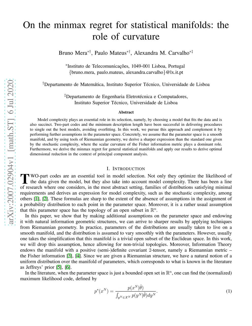 Model complexity plays an essential role in its selection, namely, by choosing a model that fits the data and is also succinct. Two-part codes and the minimum description length have been successful in delivering procedures to single out the best models, avoiding overfitting. In this work, we pursue this approach and complement it by performing further assumptions in the parameter space. Concretely, we assume that the parameter space is a smooth manifold, and by using tools of Riemannian geometry, we derive a sharper expression than the standard one given by the stochastic complexity, where the scalar curvature of the Fisher information metric plays a dominant role. Furthermore, we derive the minmax regret for general statistical manifolds and apply our results to derive optimal dimensional reduction in the context of principal component analysis.