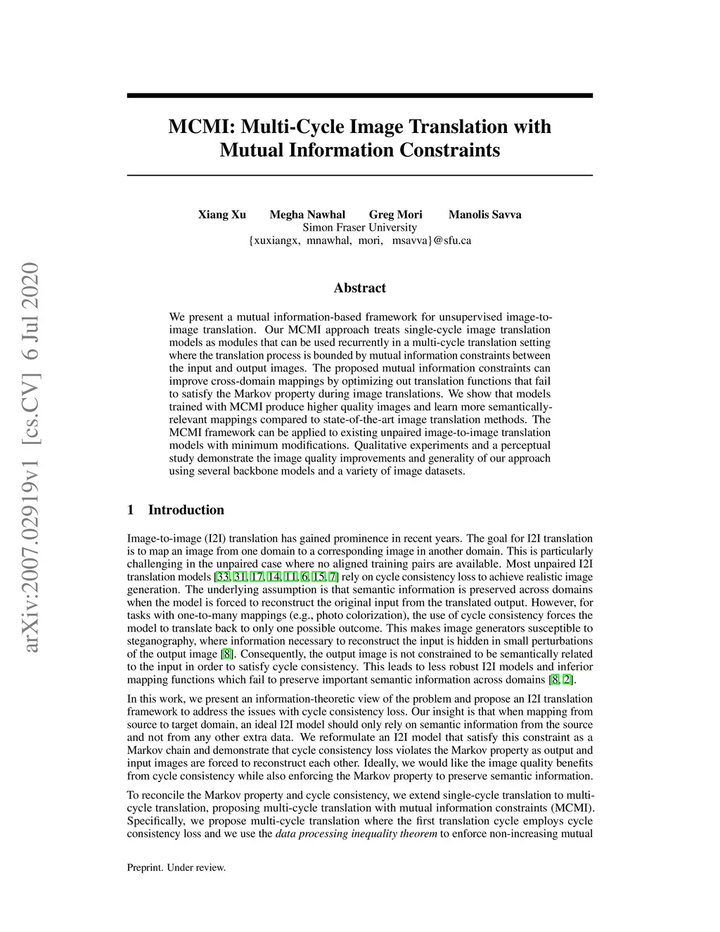 MCMI: Multi-Cycle Image Translation with Mutual Information Constraints