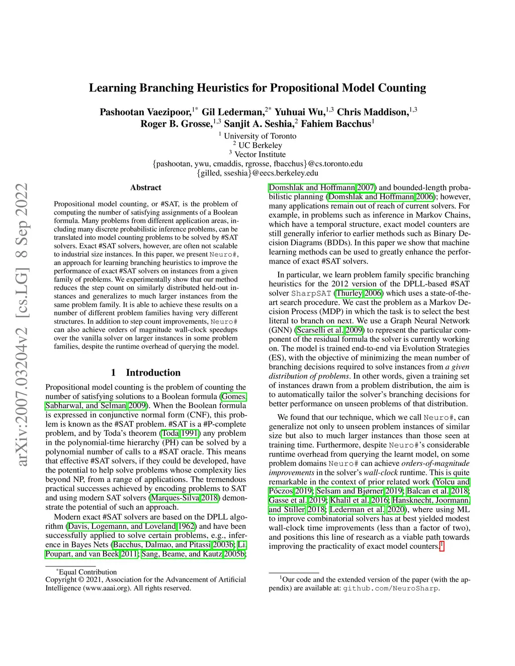 Propositional model counting, or #SAT, is the problem of computing the number of satisfying assignments of a Boolean formula. Many problems from different application areas, including many discrete probabilistic inference problems, can be translated into model counting problems to be solved by #SAT solvers. Exact #SAT solvers, however, are often not scalable to industrial size instances. In this paper, we present Neuro#, an approach for learning branching heuristics to improve the performance of exact #SAT solvers on instances from a given family of problems. We experimentally show that our method reduces the step count on similarly distributed held-out instances and generalizes to much larger instances from the same problem family. It is able to achieve these results on a number of different problem families having very different structures. In addition to step count improvements, Neuro# can also achieve orders of magnitude wall-clock speedups over the vanilla solver on larger instances in some problem families, despite the runtime overhead of querying the model.
