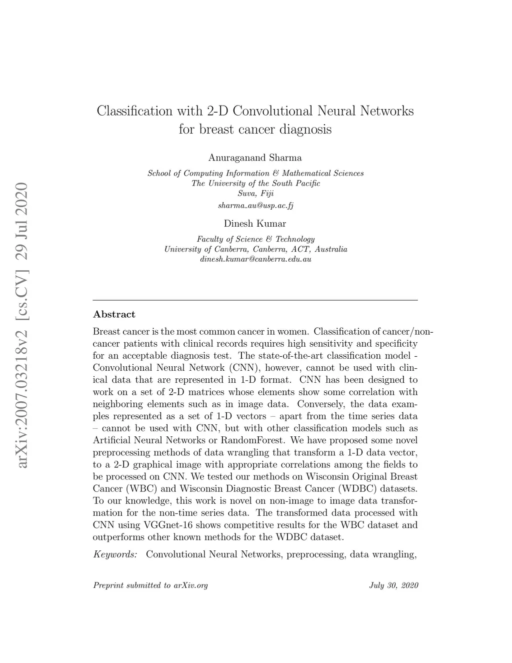 Classification with 2-D Convolutional Neural Networks for breast cancer