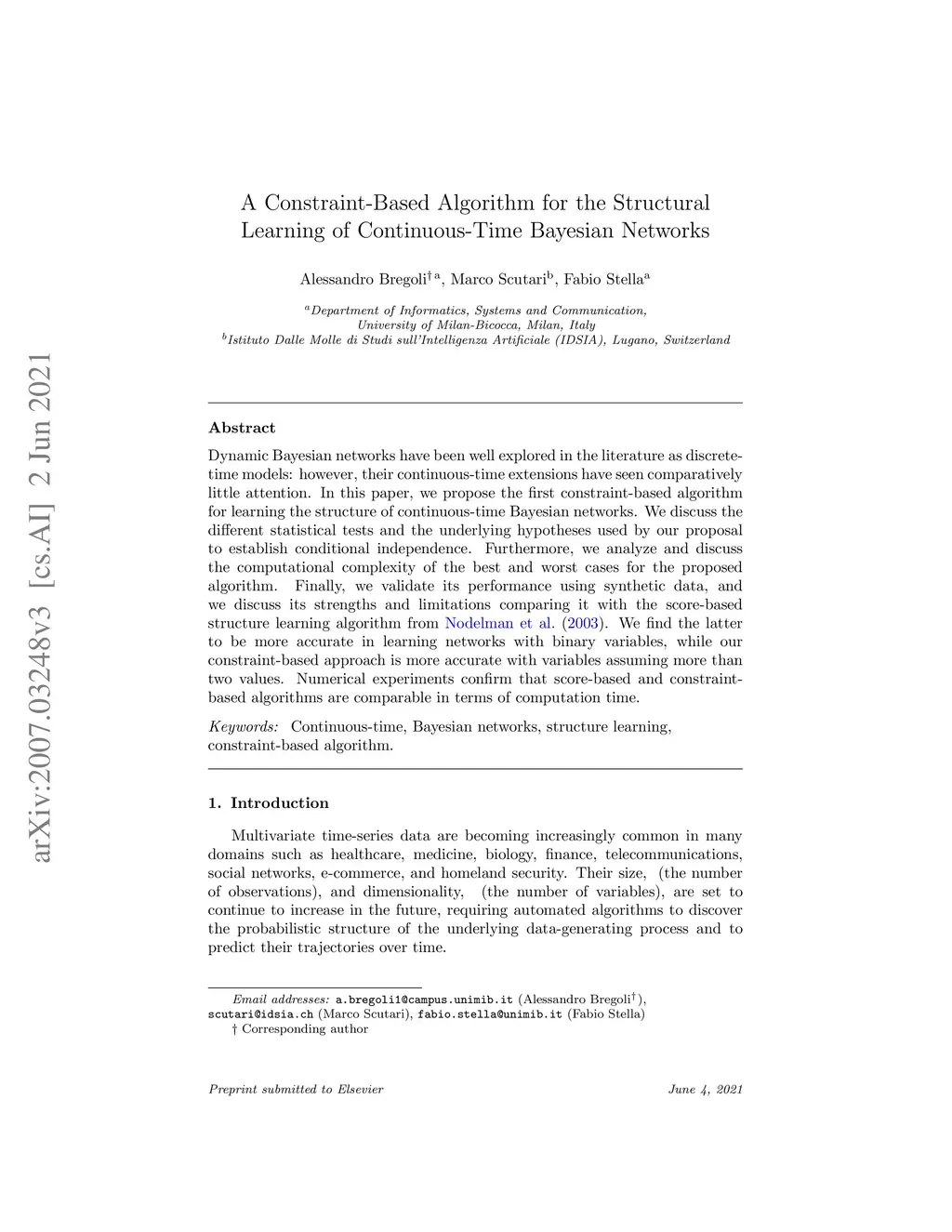 Dynamic Bayesian networks have been well explored in the literature as discrete-time models: however, their continuous-time extensions have seen comparatively little attention. In this paper, we propose the first constraint-based algorithm for learning the structure of continuous-time Bayesian networks. We discuss the different statistical tests and the underlying hypotheses used by our proposal to establish conditional independence. Furthermore, we analyze and discuss the computational complexity of the best and worst cases for the proposed algorithm. Finally, we validate its performance using synthetic data, and we discuss its strengths and limitations comparing it with the score-based structure learning algorithm from Nodelman et al. (2003). We find the latter to be more accurate in learning networks with binary variables, while our constraint-based approach is more accurate with variables assuming more than two values. Numerical experiments confirm that score-based and constraint-based algorithms are comparable in terms of computation time.