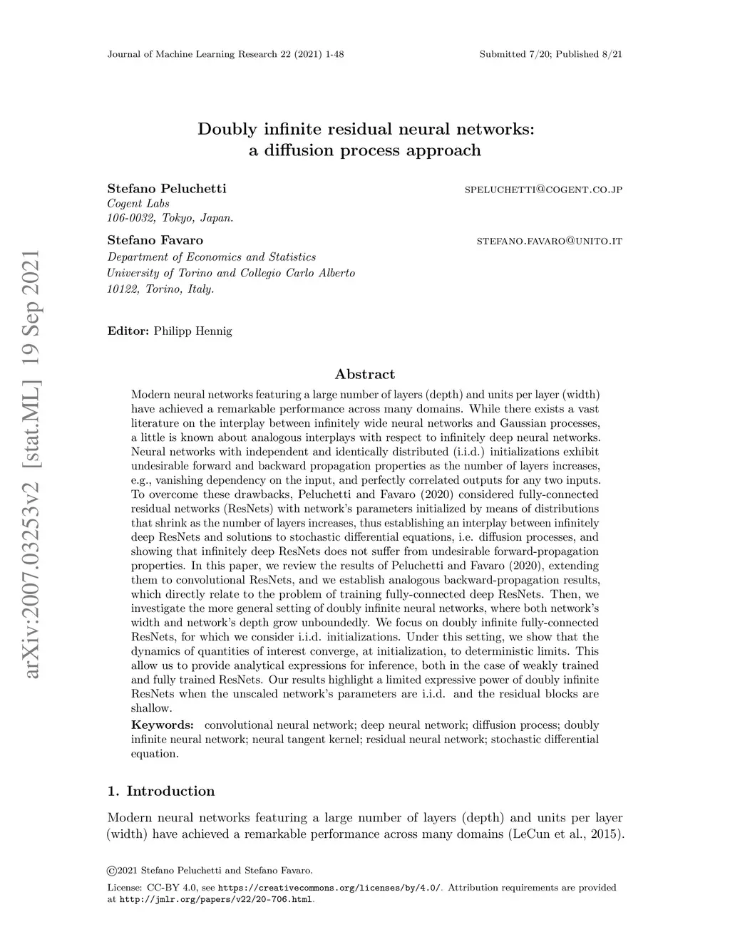 Modern neural networks (NN) featuring a large number of layers (depth) and units per layer (width) have achieved a remarkable performance across many domains. While there exists a vast literature on the interplay between infinitely wide NNs and Gaussian processes, a little is known about analogous interplays with respect to infinitely deep NNs. NNs with independent and identically distributed (i.i.d.) initializations exhibit undesirable forward and backward propagation properties as the number of layers increases. To overcome these drawbacks, Peluchetti and Favaro (2020) considered fully-connected residual networks (ResNets) with network's parameters initialized by means of distributions that shrink as the number of layers increases, thus establishing an interplay between infinitely deep ResNets and solutions to stochastic differential equations, i.e. diffusion processes, and showing that infinitely deep ResNets does not suffer from undesirable forward-propagation properties. In this paper, we review the results of Peluchetti and Favaro (2020), extending them to convolutional ResNets, and we establish analogous backward-propagation results, which directly relate to the problem of training fully-connected deep ResNets. Then, we investigate the more general setting of doubly infinite NNs, where both network's width and network's depth grow unboundedly. We focus on doubly infinite fully-connected ResNets, for which we consider i.i.d. initializations. Under this setting, we show that the dynamics of quantities of interest converge, at initialization, to deterministic limits. This allow us to provide analytical expressions for inference, both in the case of weakly trained and fully trained ResNets. Our results highlight a limited expressive power of doubly infinite ResNets when the unscaled network's parameters are i.i.d. and the residual blocks are shallow.