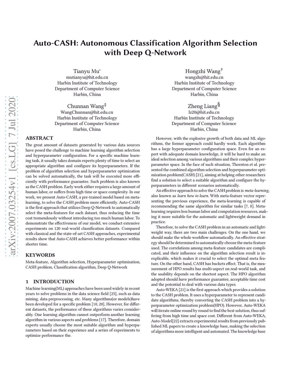 Auto-CASH: Autonomous Classification Algorithm Selection with Deep