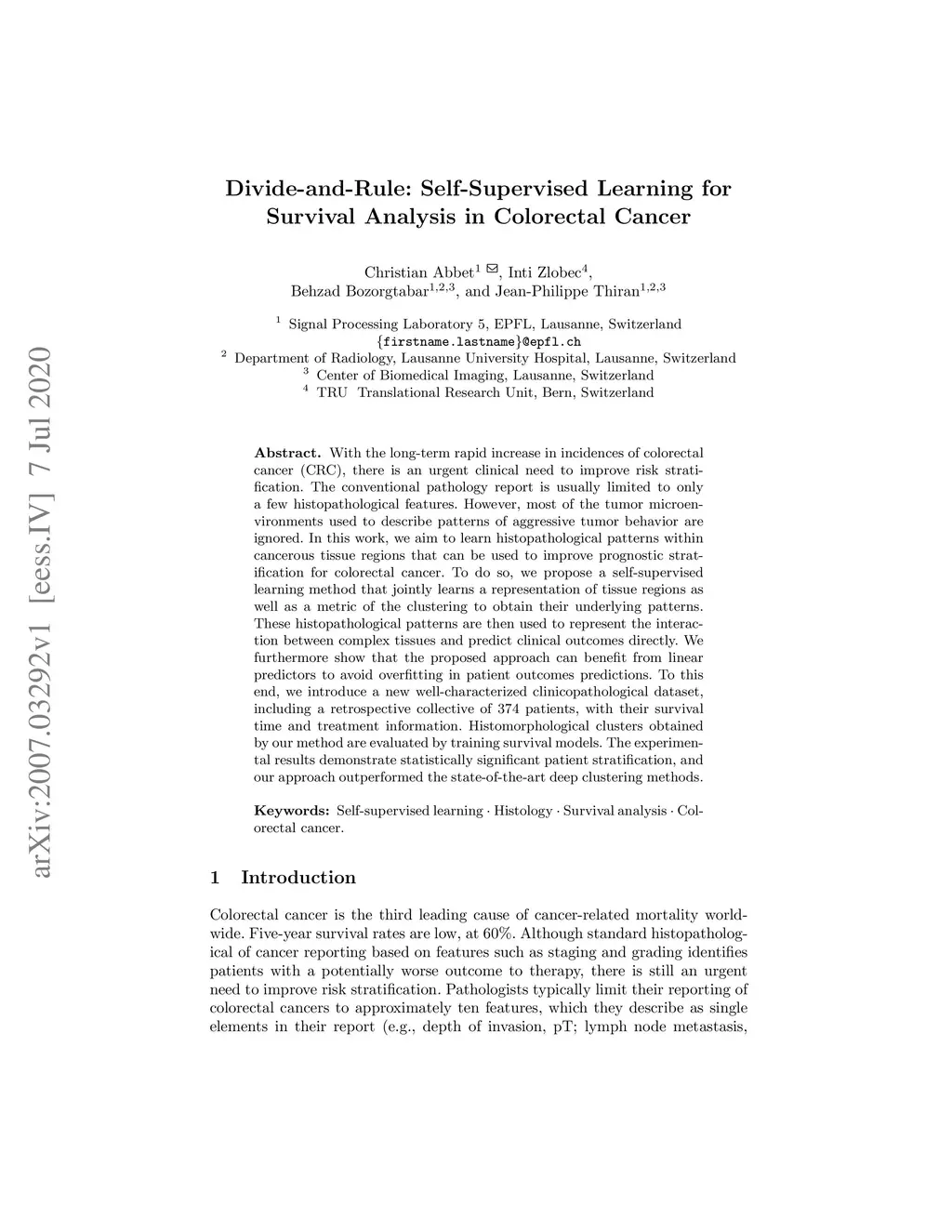 With the long-term rapid increase in incidences of colorectal cancer (CRC), there is an urgent clinical need to improve risk stratification. The conventional pathology report is usually limited to only a few histopathological features. However, most of the tumor microenvironments used to describe patterns of aggressive tumor behavior are ignored. In this work, we aim to learn histopathological patterns within cancerous tissue regions that can be used to improve prognostic stratification for colorectal cancer. To do so, we propose a self-supervised learning method that jointly learns a representation of tissue regions as well as a metric of the clustering to obtain their underlying patterns. These histopathological patterns are then used to represent the interaction between complex tissues and predict clinical outcomes directly. We furthermore show that the proposed approach can benefit from linear predictors to avoid overfitting in patient outcomes predictions. To this end, we introduce a new well-characterized clinicopathological dataset, including a retrospective collective of 374 patients, with their survival time and treatment information. Histomorphological clusters obtained by our method are evaluated by training survival models. The experimental results demonstrate statistically significant patient stratification, and our approach outperformed the state-of-the-art deep clustering methods.