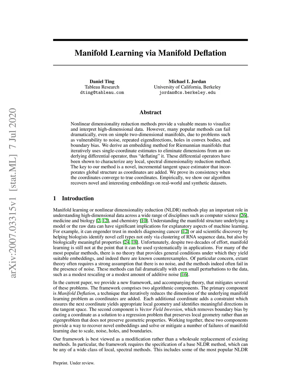 Nonlinear dimensionality reduction methods provide a valuable means to visualize and interpret high-dimensional data. However, many popular methods can fail dramatically, even on simple two-dimensional manifolds, due to problems such as vulnerability to noise, repeated eigendirections, holes in convex bodies, and boundary bias. We derive an embedding method for Riemannian manifolds that iteratively uses single-coordinate estimates to eliminate dimensions from an underlying differential operator, thus "deflating" it. These differential operators have been shown to characterize any local, spectral dimensionality reduction method. The key to our method is a novel, incremental tangent space estimator that incorporates global structure as coordinates are added. We prove its consistency when the coordinates converge to true coordinates. Empirically, we show our algorithm recovers novel and interesting embeddings on real-world and synthetic datasets.