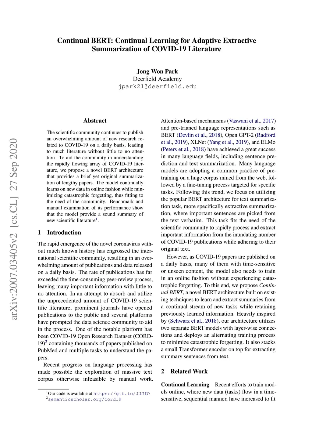 The scientific community continues to publish an overwhelming amount of new research related to COVID-19 on a daily basis, leading to much literature without little to no attention. To aid the community in understanding the rapidly flowing array of COVID-19 literature, we propose a novel BERT architecture that provides a brief yet original summarization of lengthy papers. The model continually learns on new data in online fashion while minimizing catastrophic forgetting, thus fitting to the need of the community. Benchmark and manual examination of its performance show that the model provide a sound summary of new scientific literature.