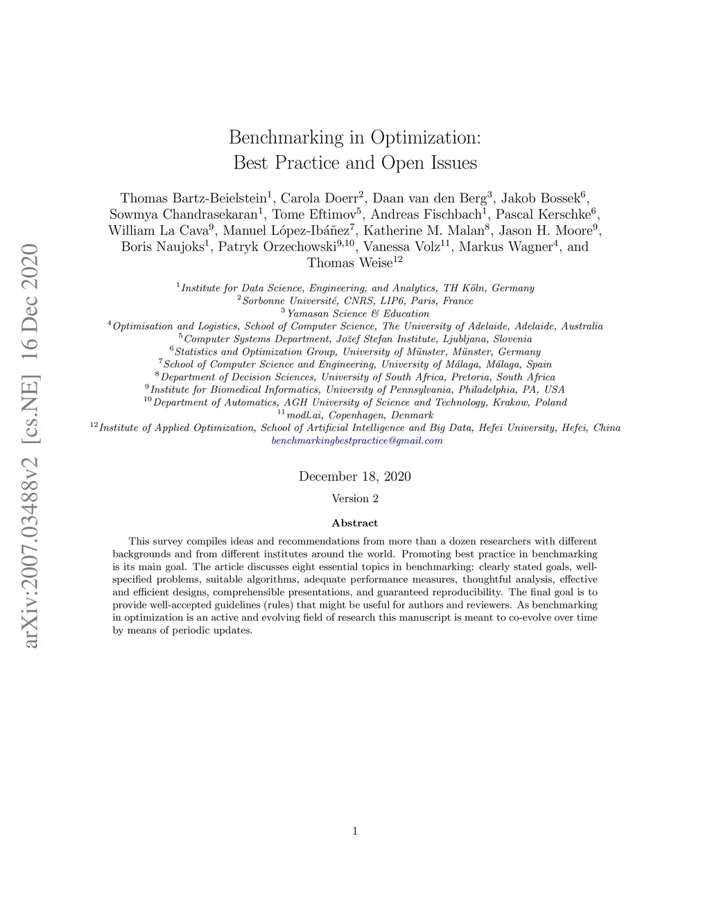 This survey compiles ideas and recommendations from more than a dozen researchers with different backgrounds and from different institutes around the world. Promoting best practice in benchmarking is its main goal. The article discusses eight essential topics in benchmarking: clearly stated goals, well-specified problems, suitable algorithms, adequate performance measures, thoughtful analysis, effective and efficient designs, comprehensible presentations, and guaranteed reproducibility. The final goal is to provide well-accepted guidelines (rules) that might be useful for authors and reviewers. As benchmarking in optimization is an active and evolving field of research this manuscript is meant to co-evolve over time by means of periodic updates.