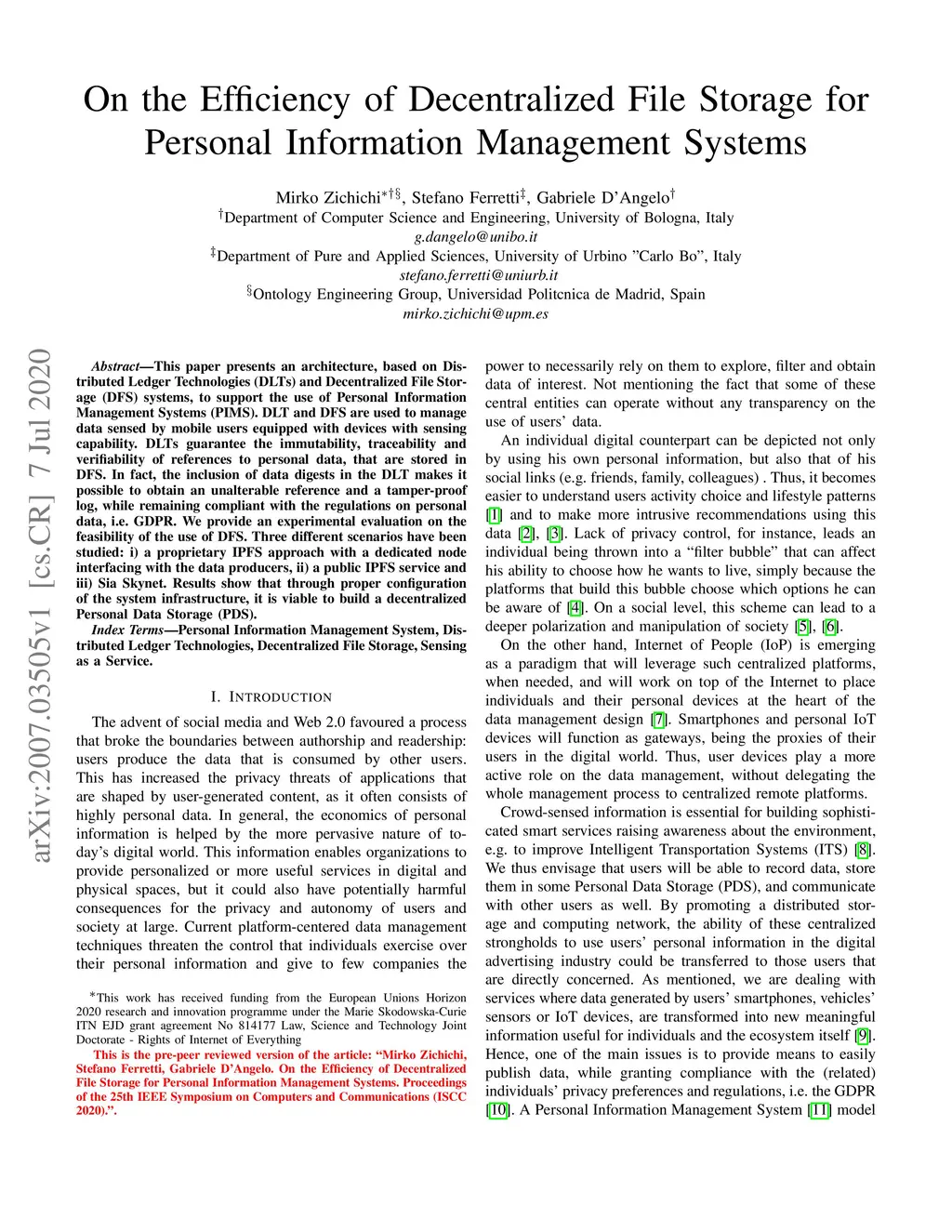 This paper presents an architecture, based on Distributed Ledger Technologies (DLTs) and Decentralized File Storage (DFS) systems, to support the use of Personal Information Management Systems (PIMS). DLT and DFS are used to manage data sensed by mobile users equipped with devices with sensing capability. DLTs guarantee the immutability, traceability and verifiability of references to personal data, that are stored in DFS. In fact, the inclusion of data digests in the DLT makes it possible to obtain an unalterable reference and a tamper-proof log, while remaining compliant with the regulations on personal data, i.e. GDPR. We provide an experimental evaluation on the feasibility of the use of DFS. Three different scenarios have been studied: i) a proprietary IPFS approach with a dedicated node interfacing with the data producers, ii) a public IPFS service and iii) Sia Skynet. Results show that through proper configuration of the system infrastructure, it is viable to build a decentralized Personal Data Storage (PDS).