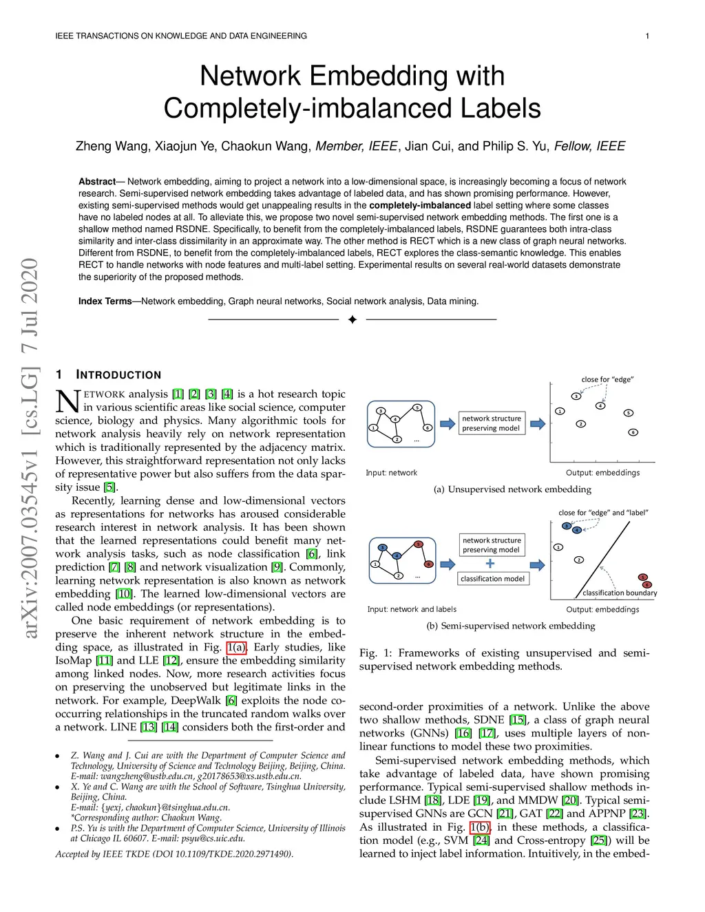 Network embedding, aiming to project a network into a low-dimensional space, is increasingly becoming a focus of network research. Semi-supervised network embedding takes advantage of labeled data, and has shown promising performance. However, existing semi-supervised methods would get unappealing results in the completely-imbalanced label setting where some classes have no labeled nodes at all. To alleviate this, we propose two novel semi-supervised network embedding methods. The first one is a shallow method named RSDNE. Specifically, to benefit from the completely-imbalanced labels, RSDNE guarantees both intra-class similarity and inter-class dissimilarity in an approximate way. The other method is RECT which is a new class of graph neural networks. Different from RSDNE, to benefit from the completely-imbalanced labels, RECT explores the class-semantic knowledge. This enables RECT to handle networks with node features and multi-label setting. Experimental results on several real-world datasets demonstrate the superiority of the proposed methods. Code is available atthis https URL.