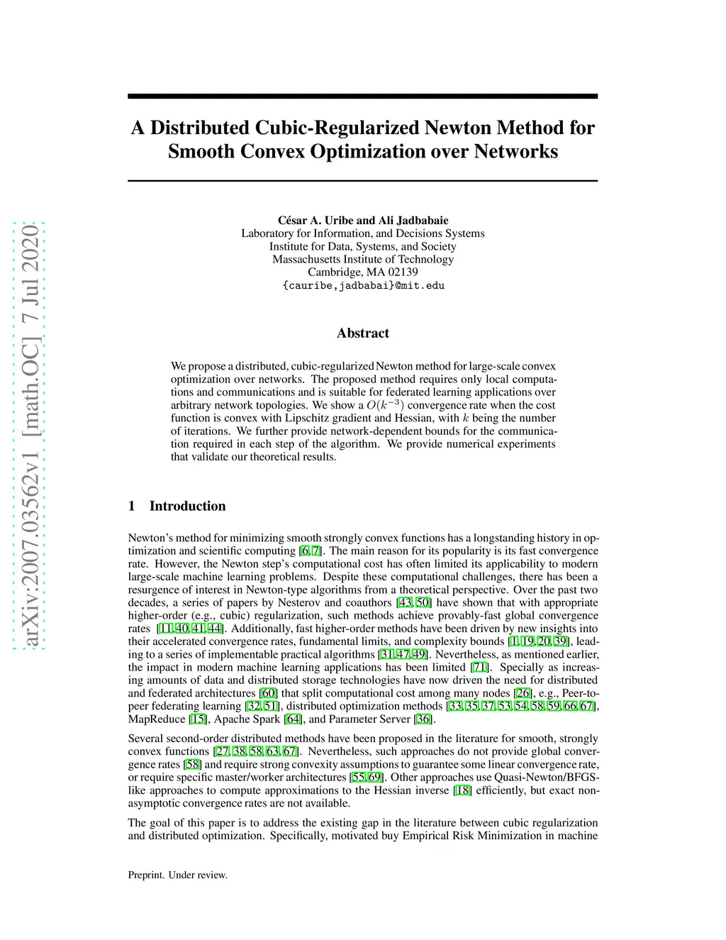 We propose a distributed, cubic-regularized Newton method for large-scale convex optimization over networks. The proposed method requires only local computations and communications and is suitable for federated learning applications over arbitrary network topologies. We show a convergence rate when the cost function is convex with Lipschitz gradient and Hessian, with being the number of iterations. We further provide network-dependent bounds for the communication required in each step of the algorithm. We provide numerical experiments that validate our theoretical results.