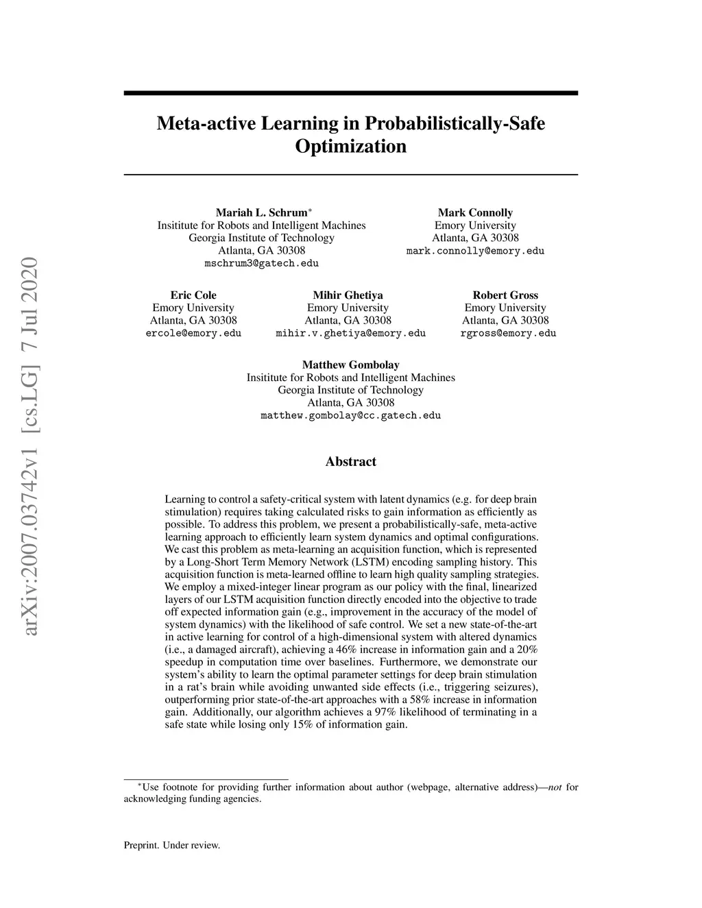 Learning to control a safety-critical system with latent dynamics (e.g. for deep brain stimulation) requires taking calculated risks to gain information as efficiently as possible. To address this problem, we present a probabilistically-safe, meta-active learning approach to efficiently learn system dynamics and optimal configurations. We cast this problem as meta-learning an acquisition function, which is represented by a Long-Short Term Memory Network (LSTM) encoding sampling history. This acquisition function is meta-learned offline to learn high quality sampling strategies. We employ a mixed-integer linear program as our policy with the final, linearized layers of our LSTM acquisition function directly encoded into the objective to trade off expected information gain (e.g., improvement in the accuracy of the model of system dynamics) with the likelihood of safe control. We set a new state-of-the-art in active learning for control of a high-dimensional system with altered dynamics (i.e., a damaged aircraft), achieving a 46% increase in information gain and a 20% speedup in computation time over baselines. Furthermore, we demonstrate our system's ability to learn the optimal parameter settings for deep brain stimulation in a rat's brain while avoiding unwanted side effects (i.e., triggering seizures), outperforming prior state-of-the-art approaches with a 58% increase in information gain. Additionally, our algorithm achieves a 97% likelihood of terminating in a safe state while losing only 15% of information gain.