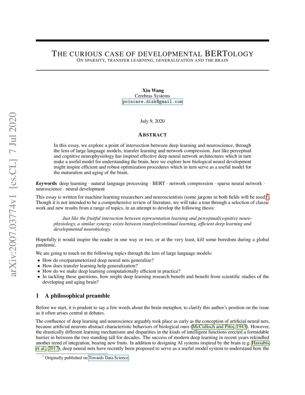 In this essay, we explore a point of intersection between deep learning and neuroscience, through the lens of large language models, transfer learning and network compression. Just like perceptual and cognitive neurophysiology has inspired effective deep neural network architectures which in turn make a useful model for understanding the brain, here we explore how biological neural development might inspire efficient and robust optimization procedures which in turn serve as a useful model for the maturation and aging of the brain.