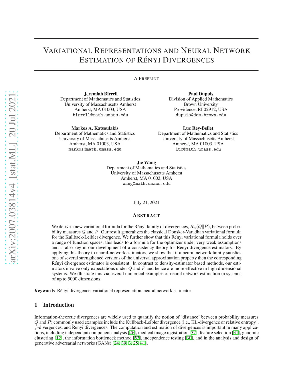 We derive a new variational formula for the R\ényi family of divergences, , between probability measures and . Our result generalizes the classical Donsker-Varadhan variational formula for the Kullback-Leibler divergence. We further show that this R\ényi variational formula holds over a range of function spaces; this leads to a formula for the optimizer under very weak assumptions and is also key in our development of a consistency theory for R\ényi divergence estimators. By applying this theory to neural-network estimators, we show that if a neural network family satisfies one of several strengthened versions of the universal approximation property then the corresponding R\ényi divergence estimator is consistent. In contrast to density-estimator based methods, our estimators involve only expectations under and and hence are more effective in high dimensional systems. We illustrate this via several numerical examples of neural network estimation in systems of up to 5000 dimensions.