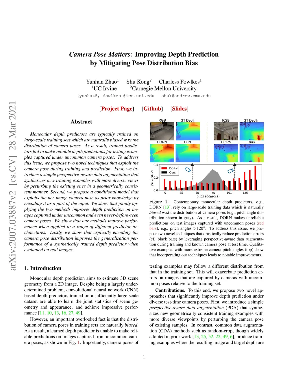 Monocular depth predictors are typically trained on large-scale training sets which are naturally biased w.r.t the distribution of camera poses. As a result, trained predictors fail to make reliable depth predictions for testing examples captured under uncommon camera poses. To address this issue, we propose two novel techniques that exploit the camera pose during training and prediction. First, we introduce a simple perspective-aware data augmentation that synthesizes new training examples with more diverse views by perturbing the existing ones in a geometrically consistent manner. Second, we propose a conditional model that exploits the per-image camera pose as prior knowledge by encoding it as a part of the input. We show that jointly applying the two methods improves depth prediction on images captured under uncommon and even never-before-seen camera poses. We show that our methods improve performance when applied to a range of different predictor architectures. Lastly, we show that explicitly encoding the camera pose distribution improves the generalization performance of a synthetically trained depth predictor when evaluated on real images.
