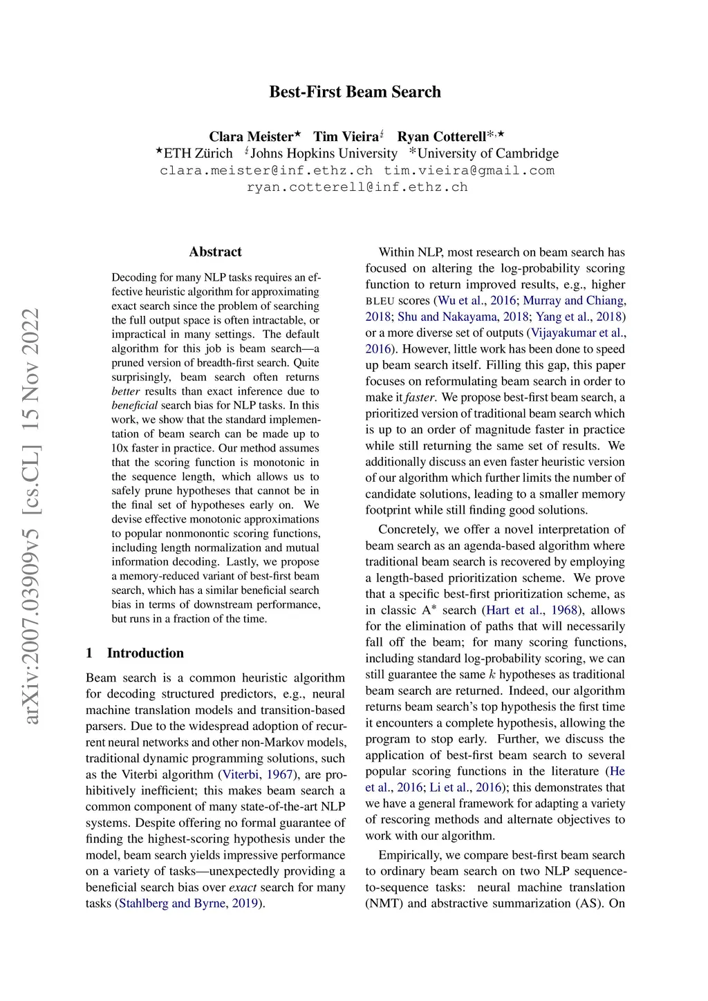 Decoding for many NLP tasks requires an effective heuristic algorithm for approximating exact search since the problem of searching the full output space is often intractable, or impractical in many settings. The default algorithm for this job is beam search -- a pruned version of breadth-first search. Quite surprisingly, beam search often returns better results than exact inference due to beneficial search bias for NLP tasks. In this work, we show that the standard implementation of beam search can be made up to 10x faster in practice. Our method assumes that the scoring function is monotonic in the sequence length, which allows us to safely prune hypotheses that cannot be in the final set of hypotheses early on. We devise effective monotonic approximations to popular nonmonontic scoring functions, including length normalization and mutual information decoding. Lastly, we propose a memory-reduced variant of Best-First Beam Search, which has a similar beneficial search bias in terms of downstream performance, but runs in a fraction of the time.