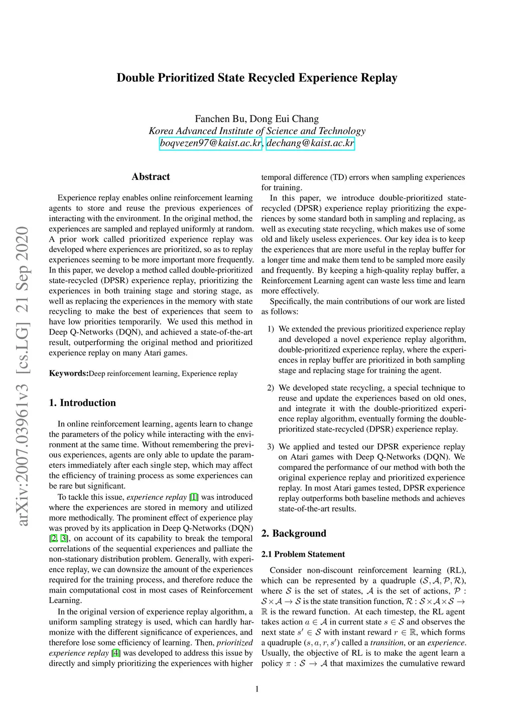 Experience replay enables online reinforcement learning agents to store and reuse the previous experiences of interacting with the environment. In the original method, the experiences are sampled and replayed uniformly at random. A prior work called prioritized experience replay was developed where experiences are prioritized, so as to replay experiences seeming to be more important more frequently. In this paper, we develop a method called double-prioritized state-recycled (DPSR) experience replay, prioritizing the experiences in both training stage and storing stage, as well as replacing the experiences in the memory with state recycling to make the best of experiences that seem to have low priorities temporarily. We used this method in Deep Q-Networks (DQN), and achieved a state-of-the-art result, outperforming the original method and prioritized experience replay on many Atari games.