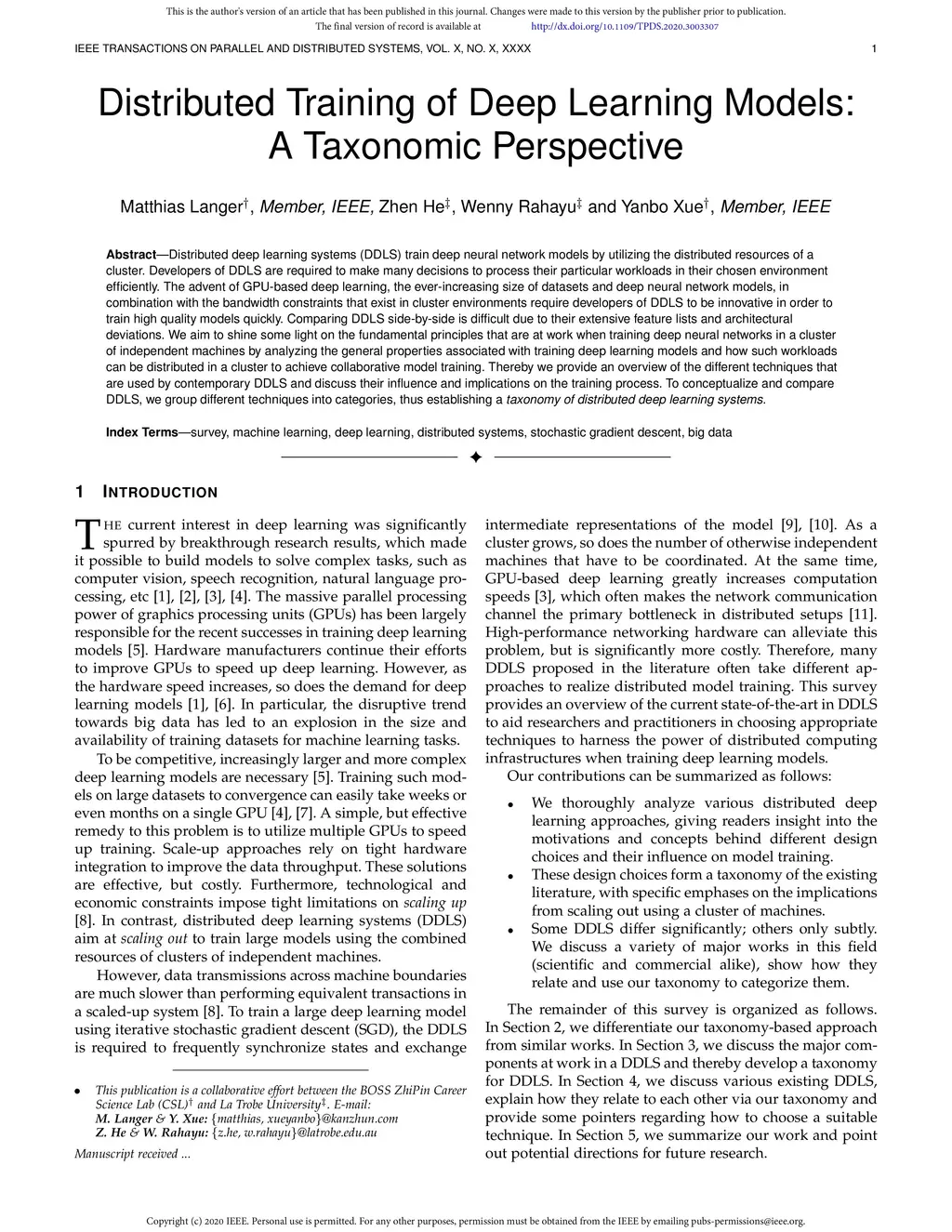 Distributed Training of Deep Learning Models: A Taxonomic Perspective