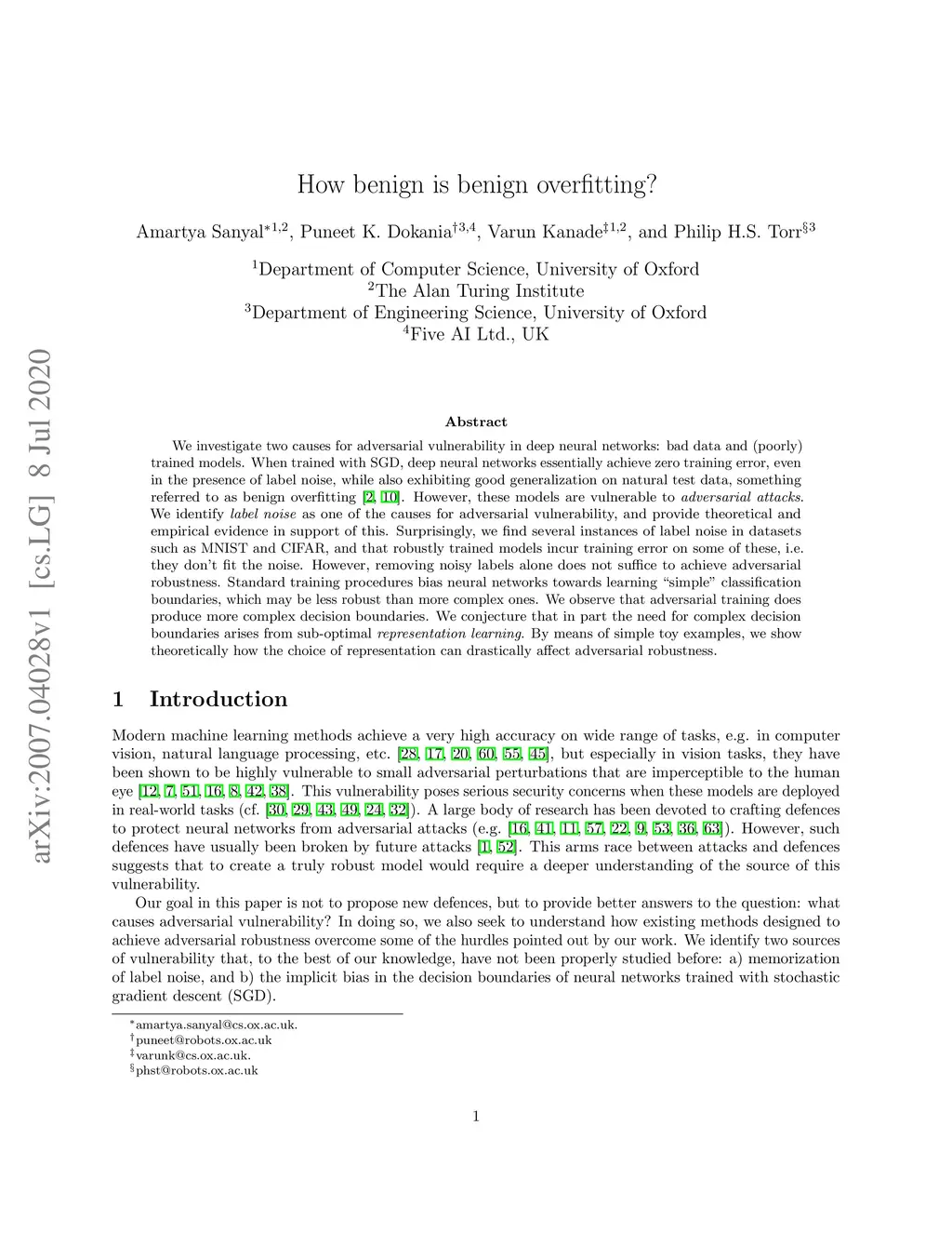 We investigate two causes for adversarial vulnerability in deep neural networks: bad data and (poorly) trained models. When trained with SGD, deep neural networks essentially achieve zero training error, even in the presence of label noise, while also exhibiting good generalization on natural test data, something referred to as benign overfitting [2, 10]. However, these models are vulnerable to adversarial attacks. We identify label noise as one of the causes for adversarial vulnerability, and provide theoretical and empirical evidence in support of this. Surprisingly, we find several instances of label noise in datasets such as MNIST and CIFAR, and that robustly trained models incur training error on some of these, i.e. they don't fit the noise. However, removing noisy labels alone does not suffice to achieve adversarial robustness. Standard training procedures bias neural networks towards learning "simple" classification boundaries, which may be less robust than more complex ones. We observe that adversarial training does produce more complex decision boundaries. We conjecture that in part the need for complex decision boundaries arises from sub-optimal representation learning. By means of simple toy examples, we show theoretically how the choice of representation can drastically affect adversarial robustness.